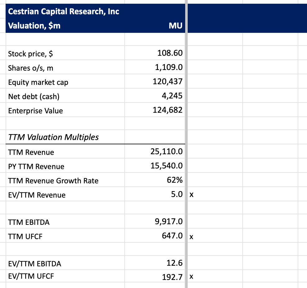 I don’t believe it makes any sense to buy or sell semiconductor companies on fundamental valuation multiples; particularly not cyclicals like MU. You may disagree. Here’s those multiples anyway.