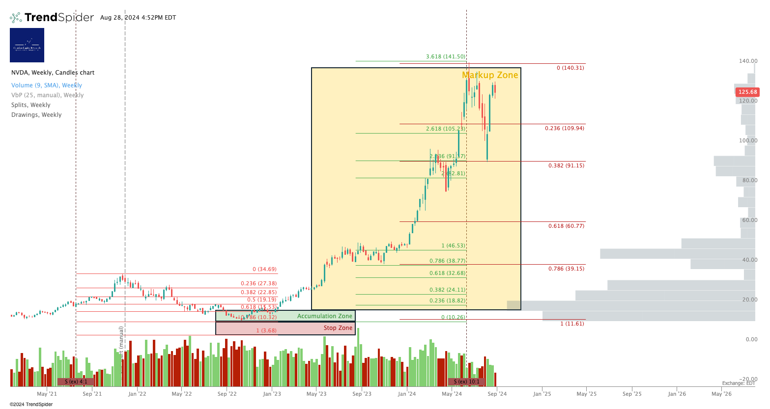 Holding at the .382 Fibonacci retracement of the move up from the Aug 5/6 lows. Bullish in my opinion. A break below $106 warrants caution. Below $90, something is wrong with the stock or the market or both, so extreme caution at that point.