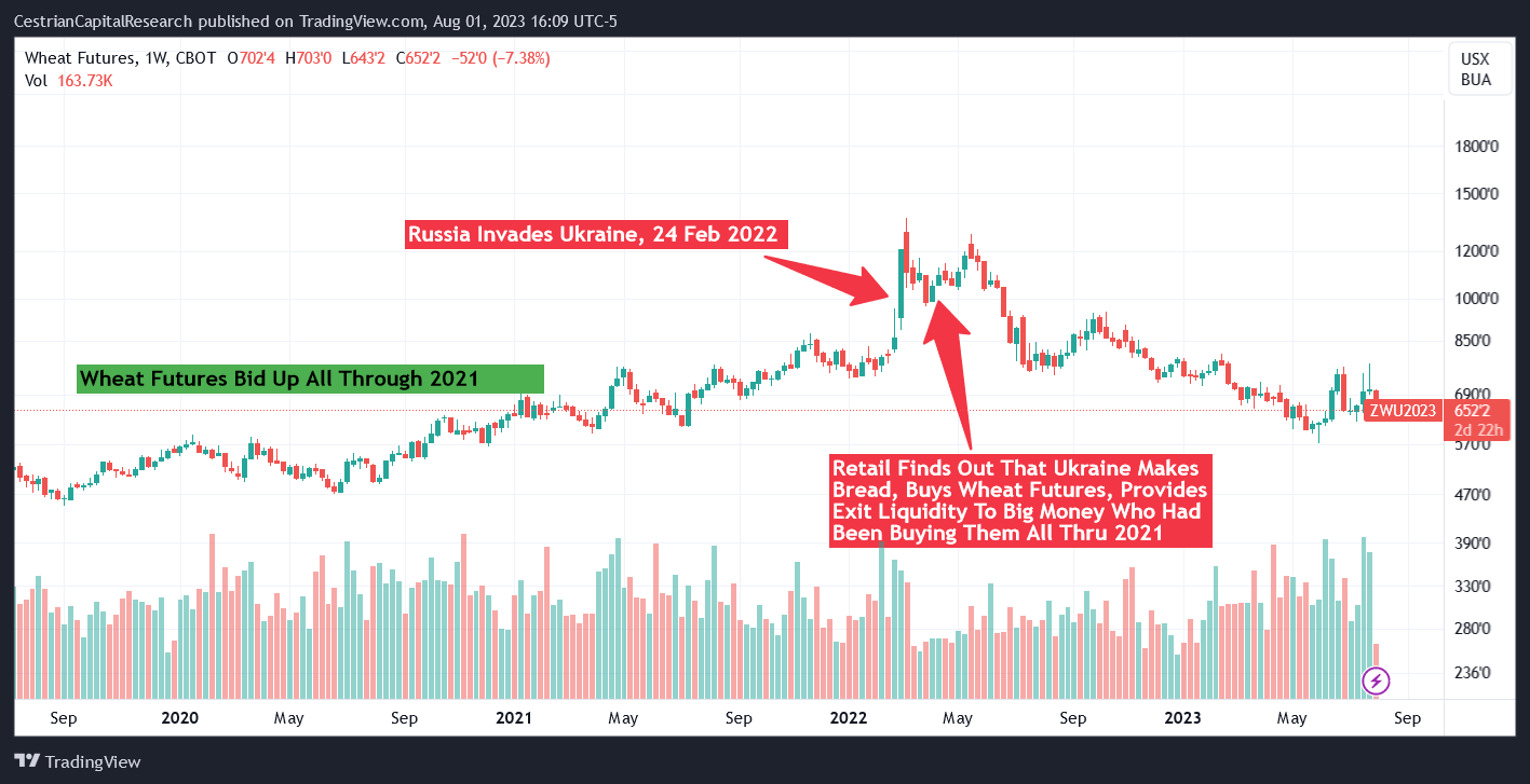 Big Money's job is to inhabit the corridors of power so closely that it becomes indistinguishable as to who is making policy and who is shaping and informing that policy. The little people - retail and a good many hedge funds too - got all excited about wheat futures after grain exports from Ukraine slowed dramatically. But because Big Money knew that Russia was serious about invading Ukraine - contrary to the narrative that said it was just a military exercise - they had already loaded the boat on wheat. Then along come the marks to buy all that wheat from Big Money in Q1 2022 onwards.