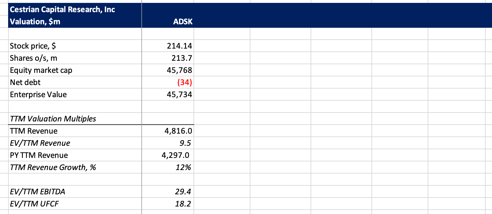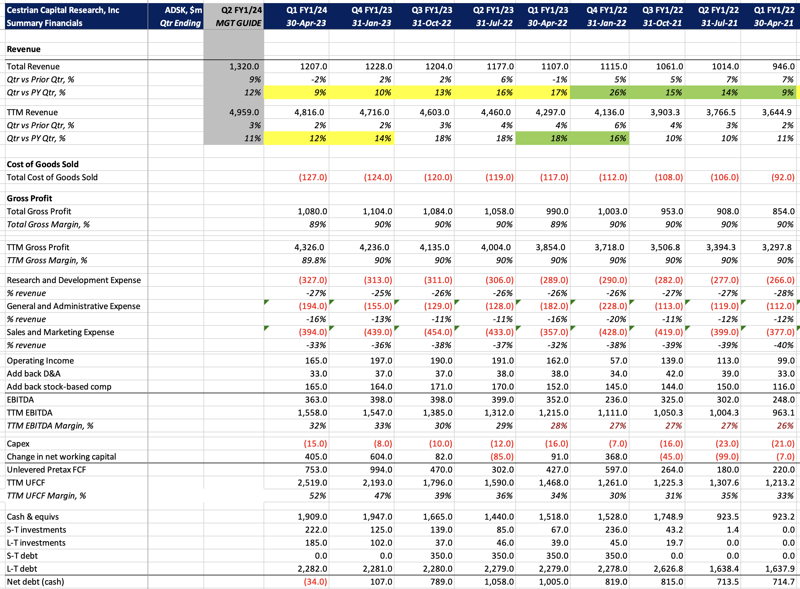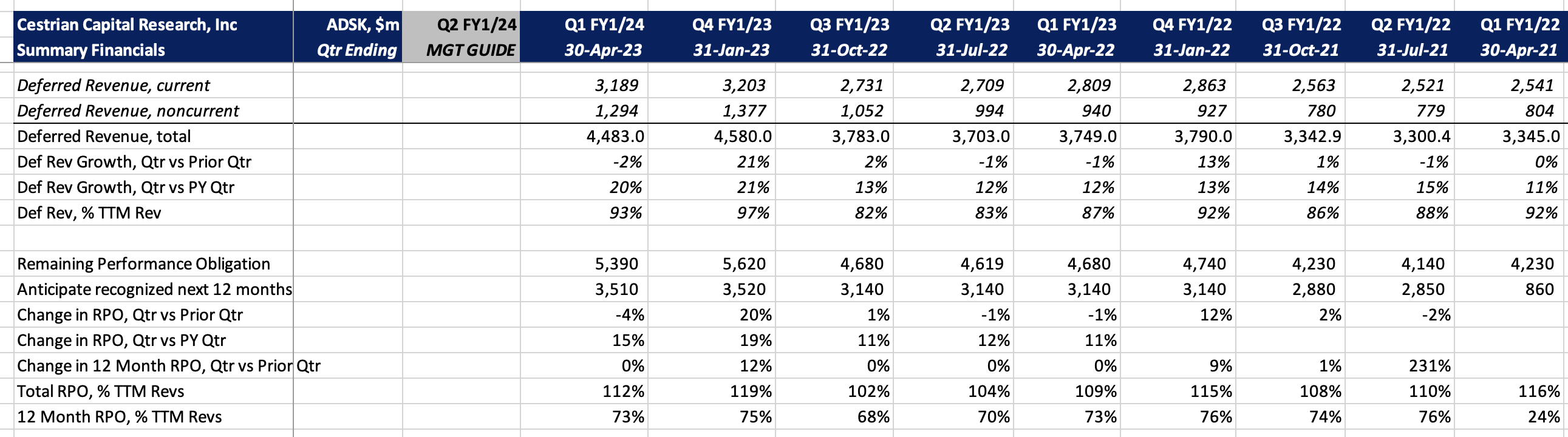 Remaining Performance Obligation - that's the total forward order book - sits at 1.1x TTM revenue, and it's growing at 15% pa, faster than is recognized revenue. So whilst we cannot make a direct, linear read-across, we can say that RPO growth is faster then TTM revenue growth = meaning that it's unlikely ADSK misses a revenue number in any meaningful way in the next 1-2 quarters.
