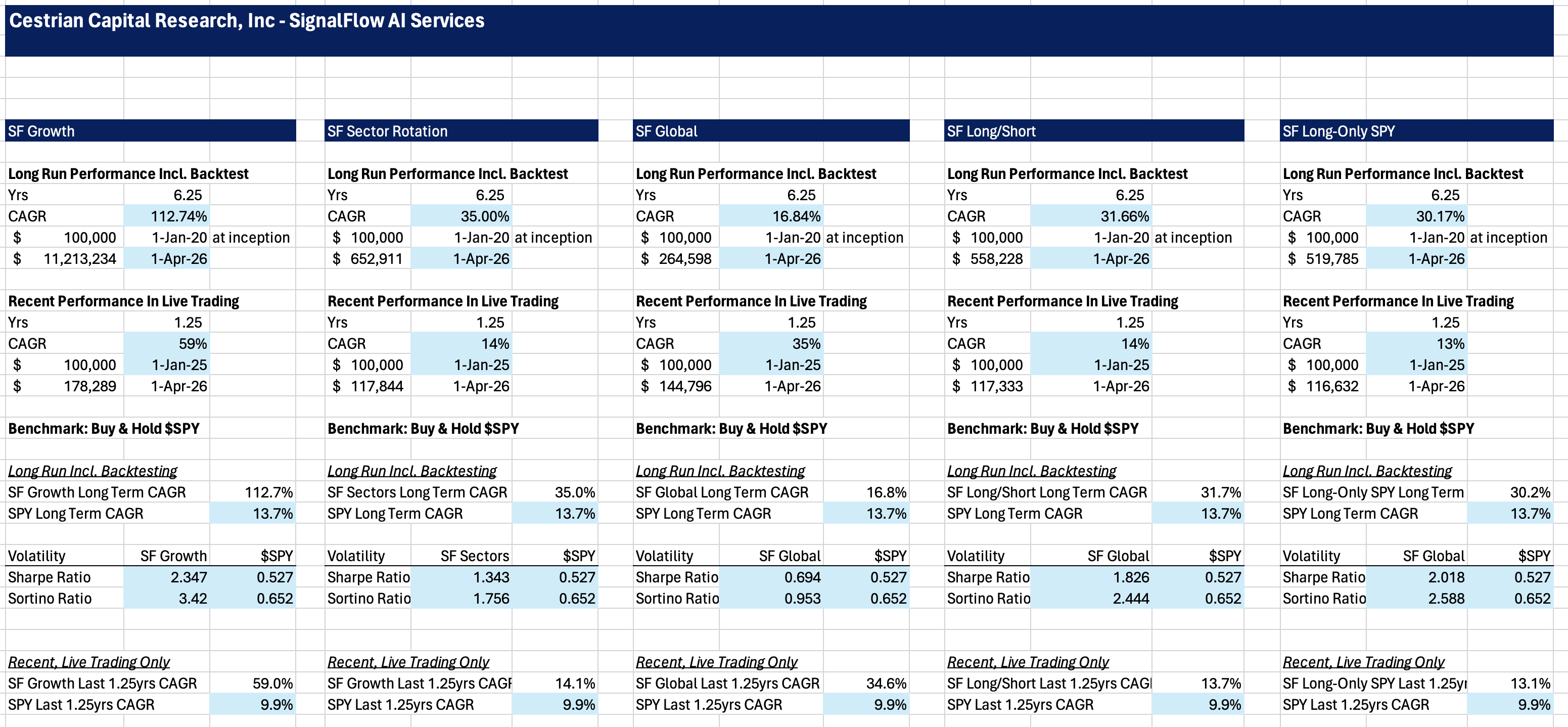 We offer a series of SignalFlow AI services to suit multiple types of portfolio approach. Here’s a snapshot of how they have performed to date. Note, the 6.25yr period includes about 5 years of backtesting; that’s interesting, but of course backtesting is backtesting. The most relevant performance data I think is the period from 1 Jan 2025 to date - this is all live trading.