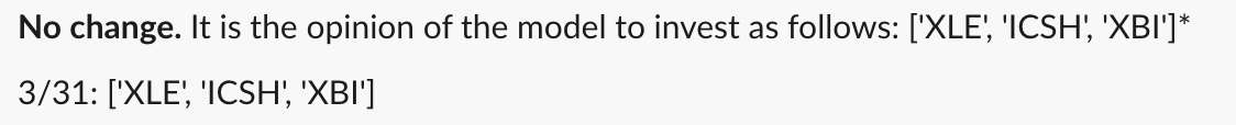 So at today’s close, the Sector Rotation models held the view that owning energy, biotech, and cash (ICSH is a very short term bond fund akin to cash - some users just use cash!), is a promising setup for tomorrow. Of course, the algos won’t make every call correctly; many times their opinions will be wrong. But risk management is built into the models; they will get out of a losing position fast, much faster in my experience than even a skilled human trader.