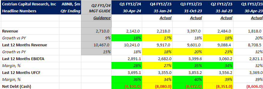 - ABNB posted a solid Q1 FY12/2024, with TTM revenue growth steady at 18%. Both EBITDA and UFCF margins increased.