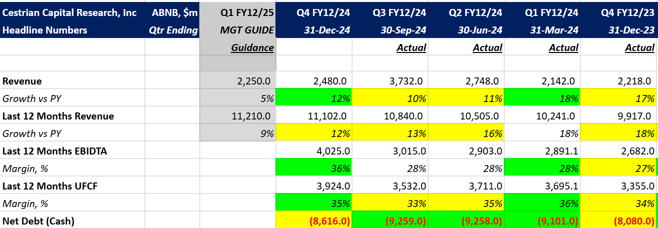 Airbnb ($ABNB) wrapped up FY12/2024 with Q4 revenue, nights booked, and Gross Booking Value (GBV) all accelerating sequentially. Revenue in Q4 grew 12% year-over-year (YoY), with both EBITDA and free cash flow margins expanding. The balance sheet remains strong, with $8.6 billion in cash.