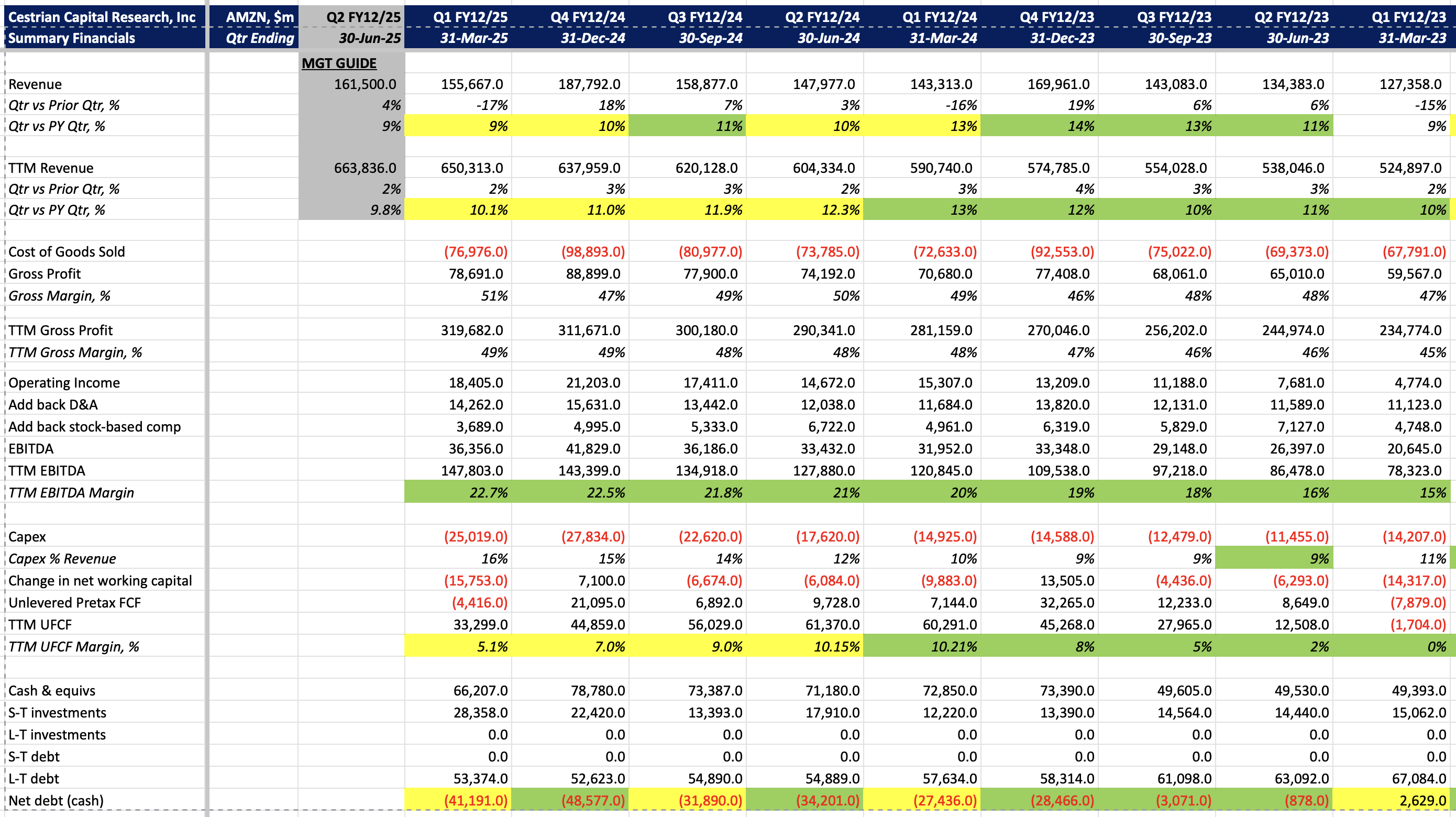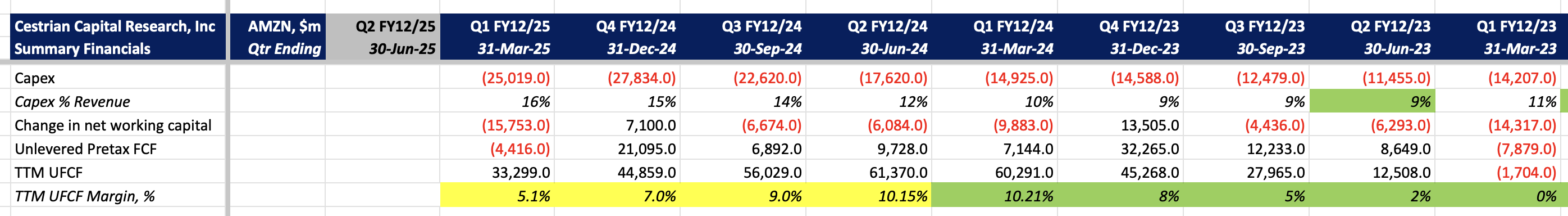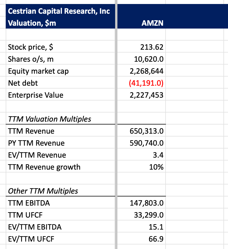 Inexpensive on revenue or EBITDA multiples, AMZN is becoming pricier on cashflows because … you guessed it … capex. (Well, also a big working capital outflow this quarter, but that’s probably going to flow back in over the next 3-4 quarters).