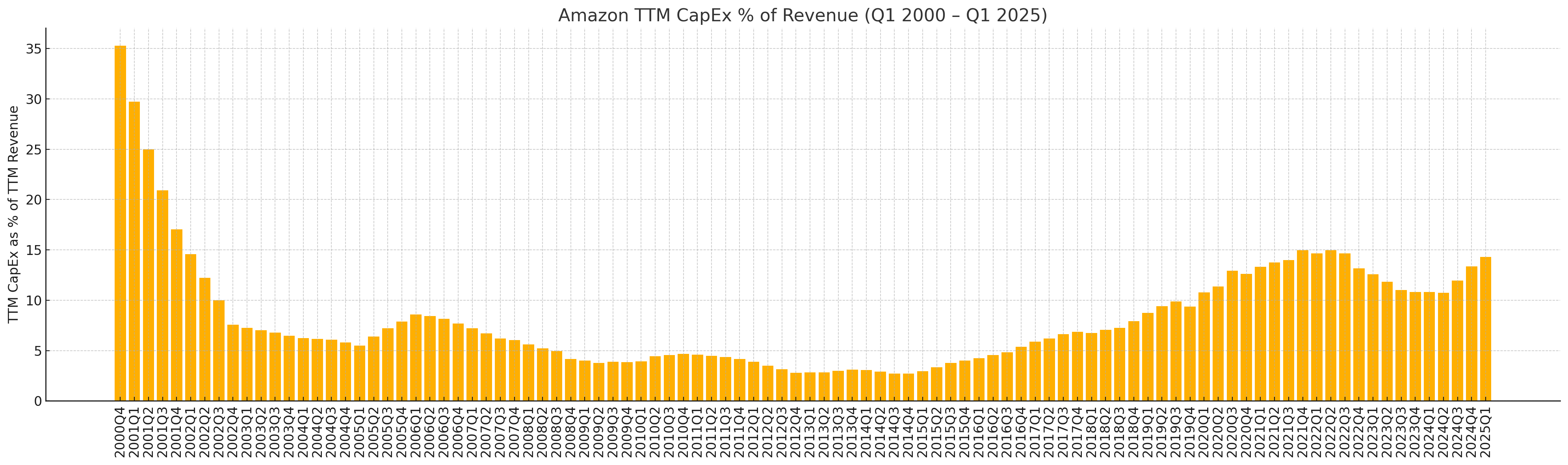 Here’s Amazon’s capex as a % of revenue according to our somewhat recalcitrant first year analyst, ChatGPT. (When I asked it to make this chart, it suggested that I make it myself. Like that.)
