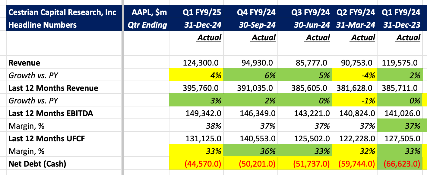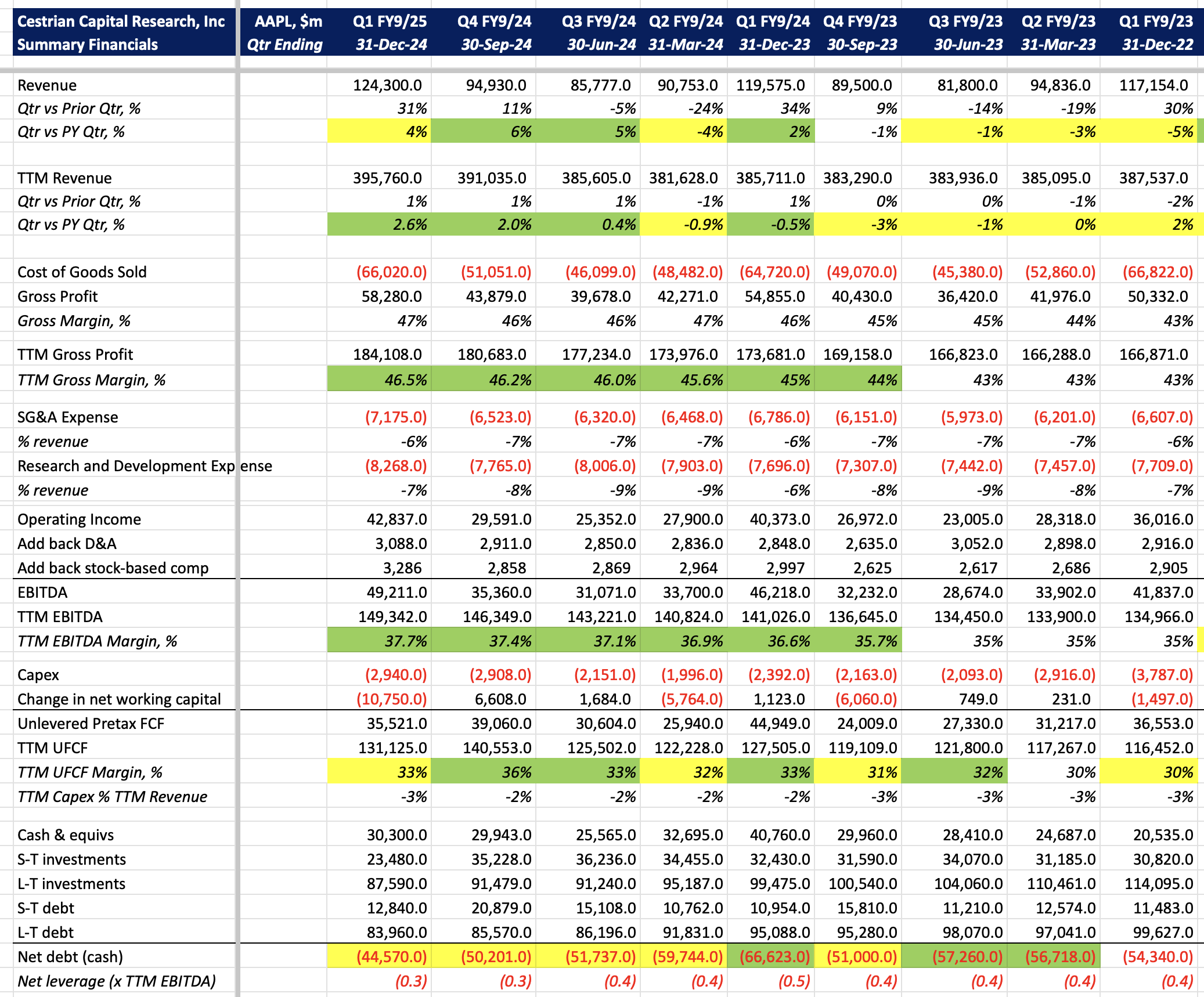 The drop in cashflow margins is due to the outflow of working capital - this is likely in part the sale of a lot of iPhones around quarter end for which Apple has yet to be paid; I would expect the working capital swing to come back in the company’s favor in Q2 (the March 2025 quarter).