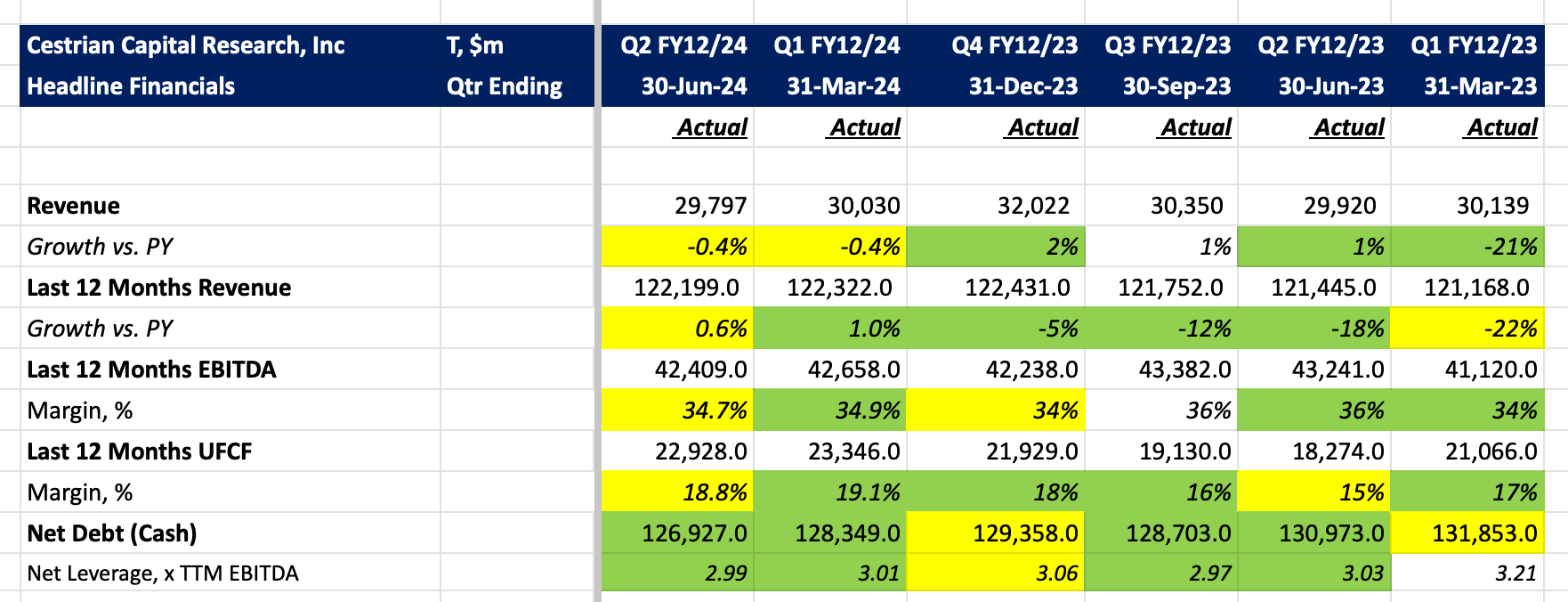 - TTM EBITDA and TTM unlevered pretax free cashflow margins both down a little to 34.7% and 18.8% respectively; nothing to worry about at this stage.