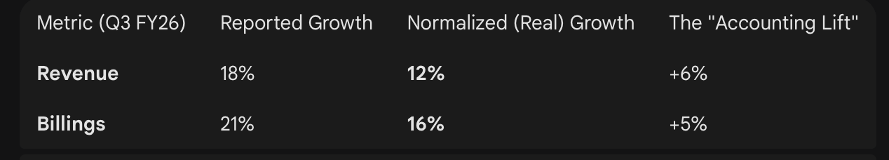 In Q3 (ending 31 October 2025), Autodesk’s recognized revenue growth looked good, but the the company is guiding to a slowdown. Further, the recognized numbers include a change in sales model wherein revenues are biasing over from reseller to direct-sale, which flatters growth a little. Google Gemini estimated the benefit as follows: