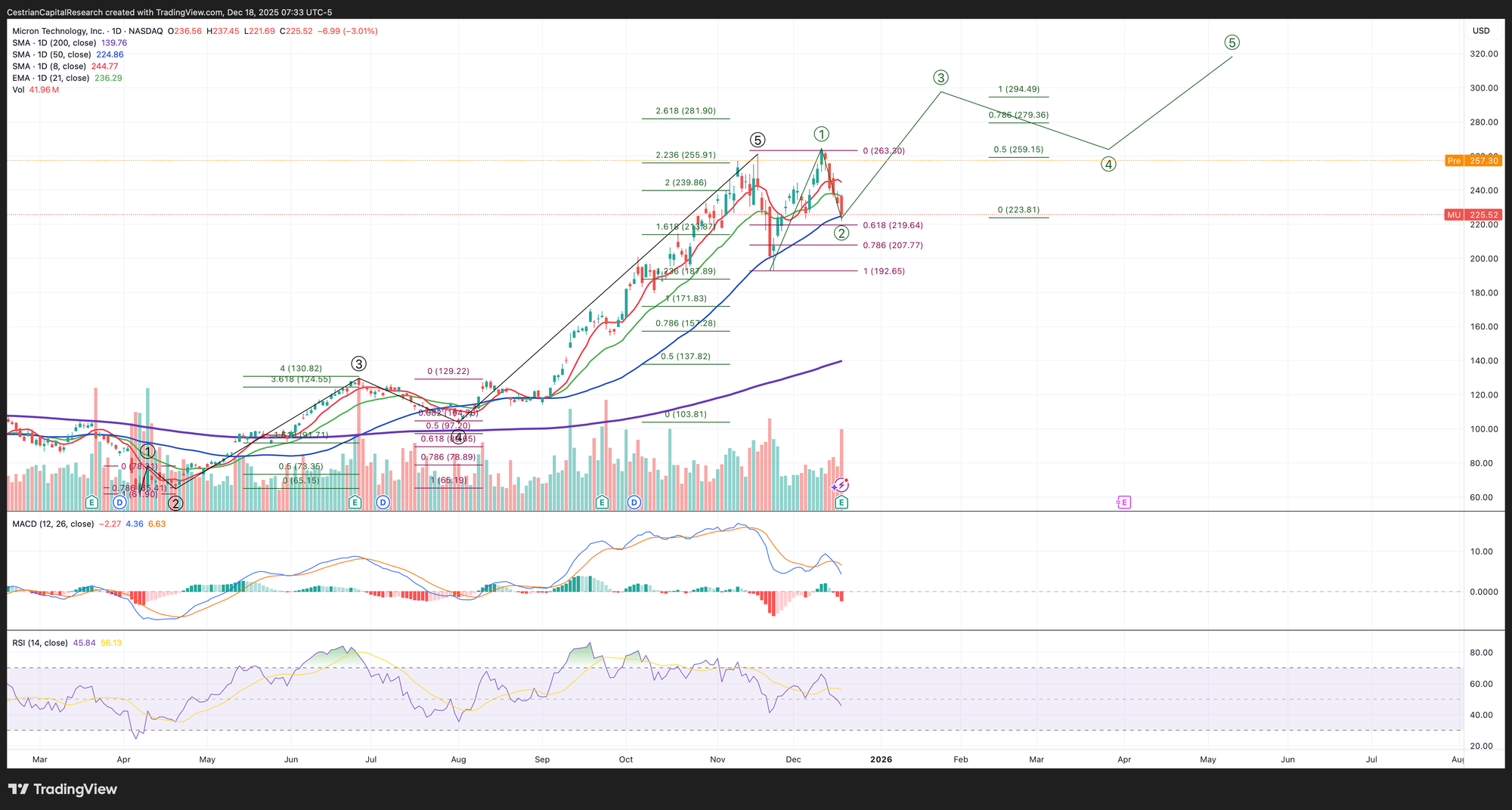 We rate Micron at Hold BUT if it starts dropping it can drop a lot, so have some risk management in mind. The 50-day moving average at $225 is a pretty good line in the sand (here).