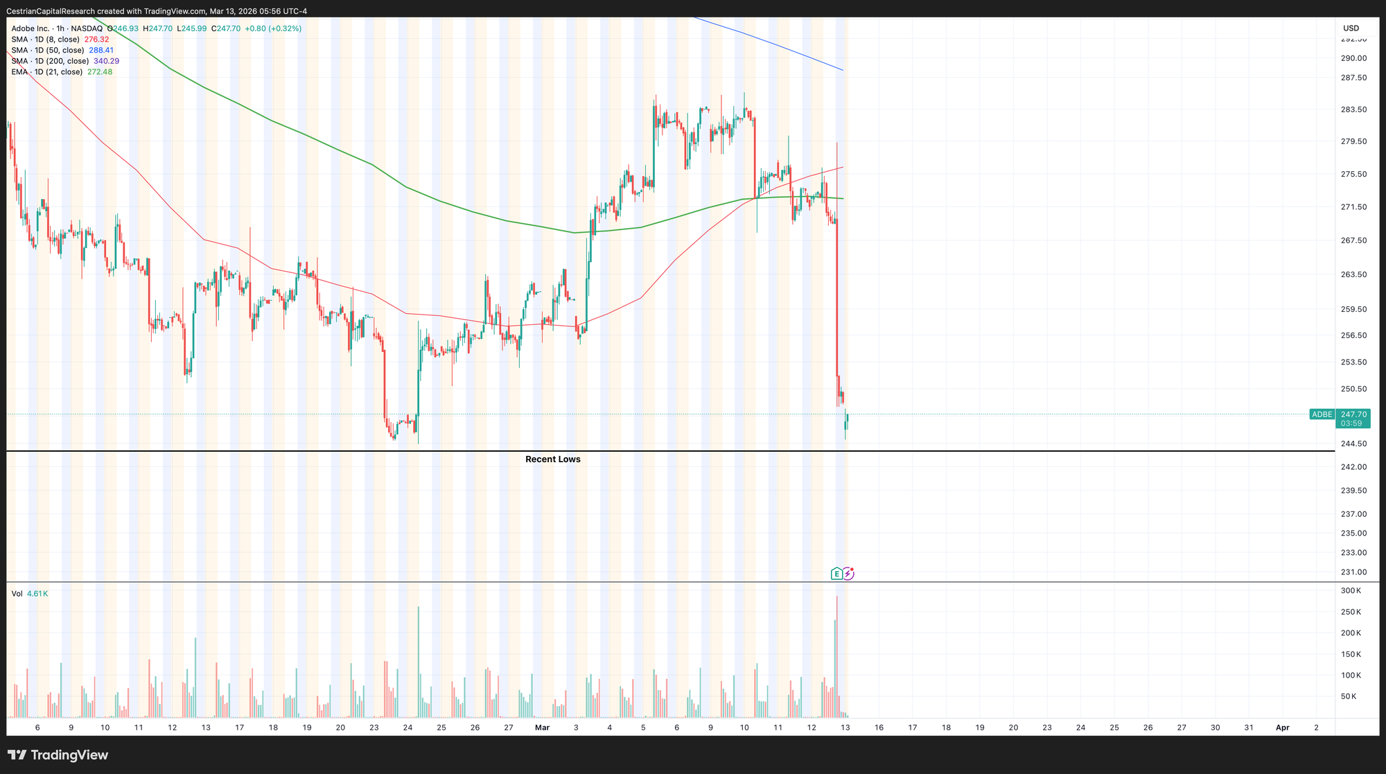We rate ADBE at Accumulate but for me that needs to be on a very tight leash. If the stock makes new lows, all bets are off; you want to see this name holding over the recent lows and you are looking for a move up on a new CEO announcement. In general, software looks bullish right now; I think it will lead the market up whenever the war in Iran de-escalates, allowing oil prices to fall back and therefore inflation concerns, bond yields and input costs to fall back too.