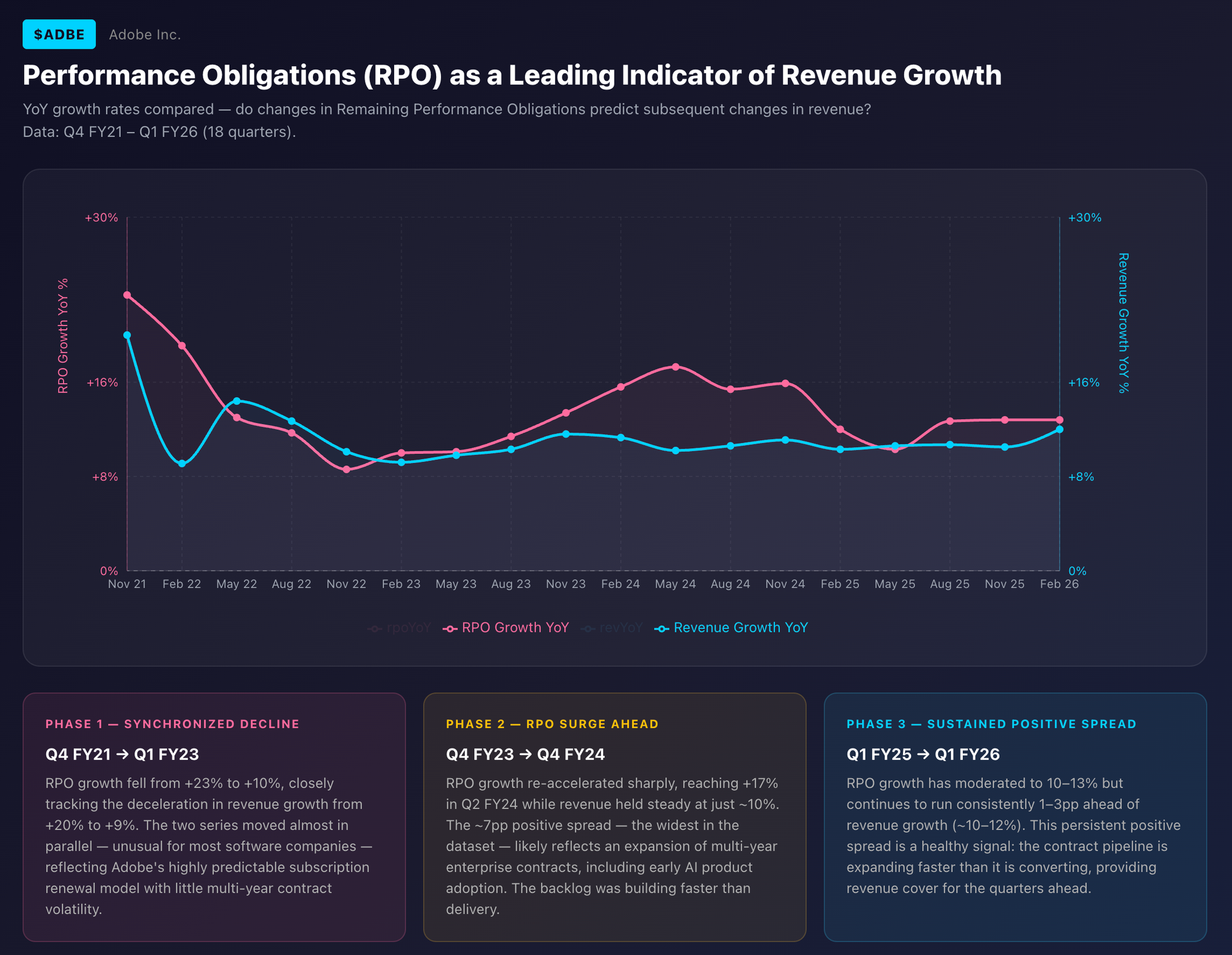 It’s possible we see some further acceleration in revenue growth. Adobe’s order book (RPO) and deferred revenue (the prepaid element of the order book) both saw slight accelerations in growth rates. Looking at the historical relationship between deferred revenue, RPO, and revenue growth, the story is unclear when we look at deferred revenue; but RPO is a reasonable predictor.