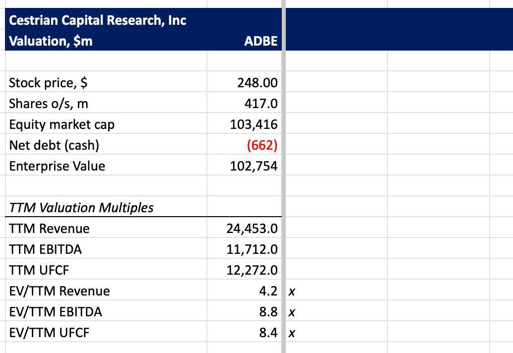 - As per other major enterprise software names today, Adobe is building AI into the product. Firefly — Adobe's generative AI model — is embedded directly into Creative Cloud apps. I expect to see this “AI Inside” method be touted all around Wall St by the big enterprise software companies in the next 12 months.