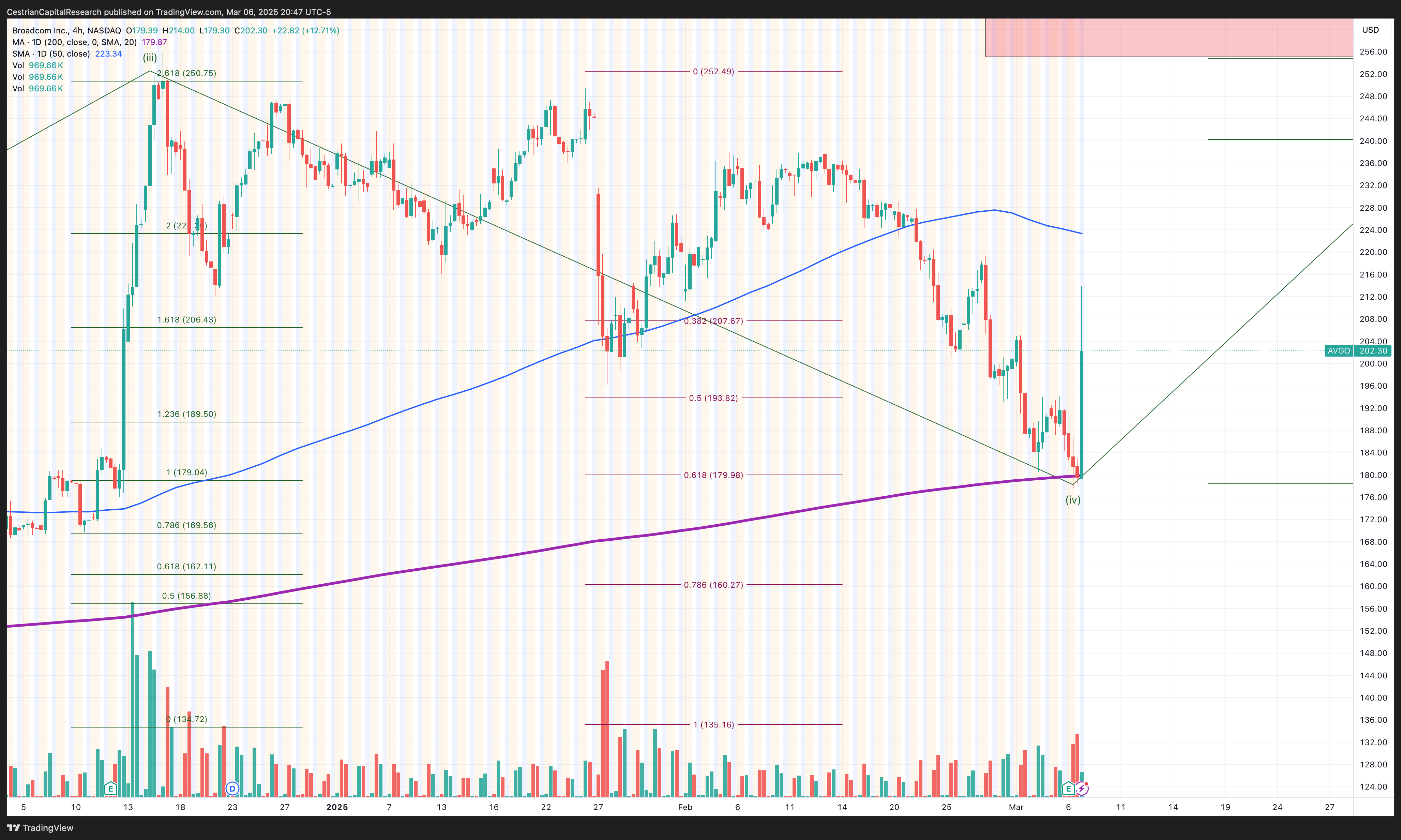 Today, before the close, Broadcom stock ($AVGO) hit its 200-day moving average, to the dollar. It also put in a Wave 4 low at the 61.8% Fibonacci retracement from the top to the bottom of the prior Wave 3. And it did all this about 20 minutes before the company printed its Q4 earnings.