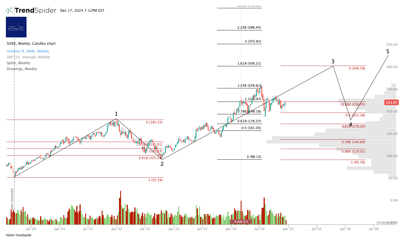 Let’s take the semiconductor ETF, $SOXX. I personally believe this thing is taking a breather on the way up to a much higher level. The earnings print from $AVGO last week catalyzed a new bull impulse in the ETF and I think an $NVDA reversal to the upside is due, which if it happens will do the same to $SOXX. My view is informed by this chart, and my timeframe on this long thesis is weeks/months. For context I am a little cautious on how much further the overall market can run up, I do not subscribe to the “Moon Soon” thesis of US equities, and so I believe in the end any potential rally in $SOXX will be capped by an eventual reversal in US equities at large. Want me to put a number on it? Let’s say a medium-term target of $300, just below the 1.618 Wave 3 extension on the chart below. (You can open a full page version of this chart, here). I am long $SOXL personally, by the way, so I am most certainly talking my own book here.
