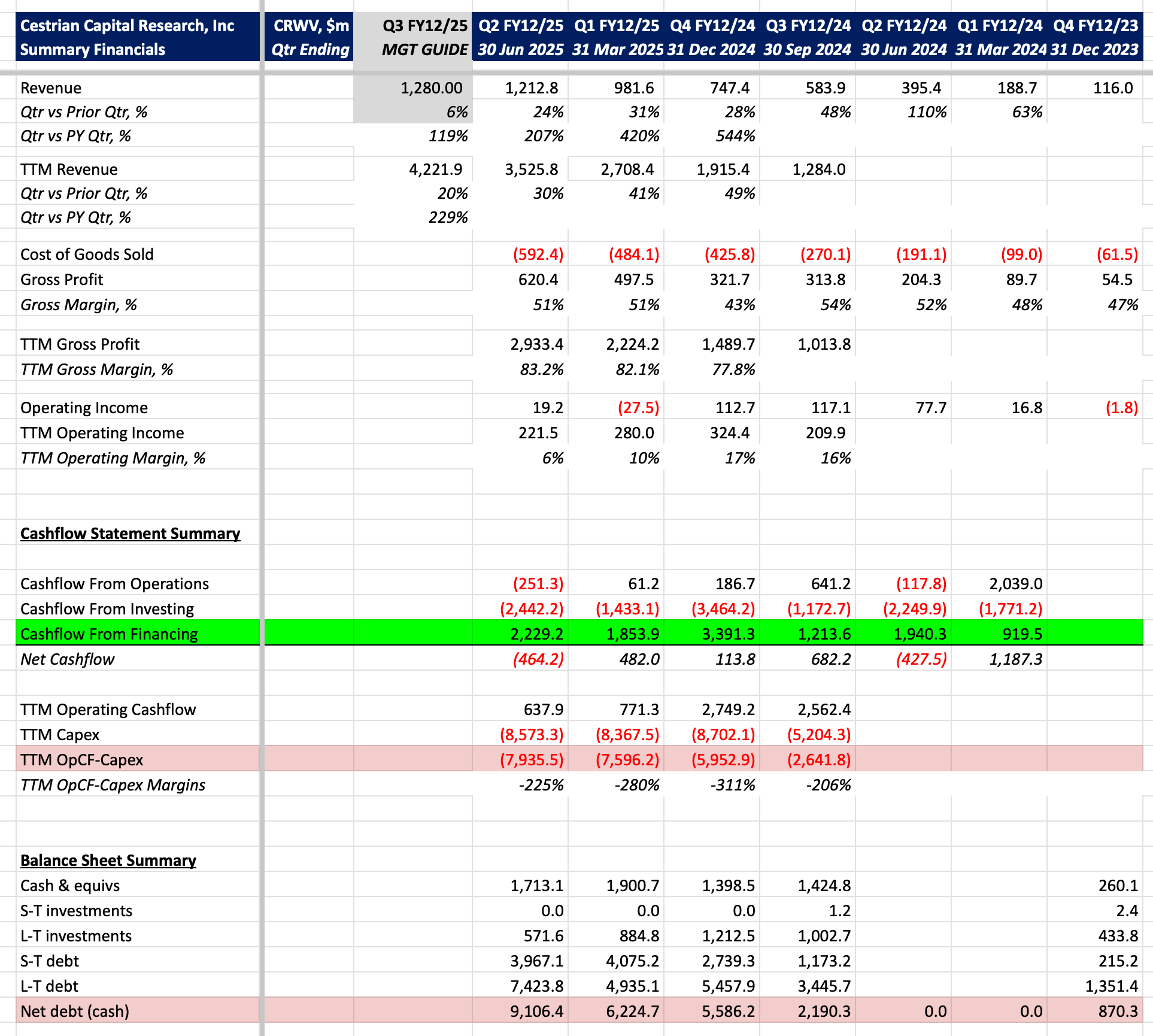 Secondly, if you’re new to accounting, for the avoidance of doubt, cashflow is not supposed to be something that shareholders and bondholders give to you to spend. It is supposed to be the other way around. The only positive cashflow contribution at CRWV is from financing ie. the raising of debt and equity to pay the electricity bills. Operating cashflow minus capex (basically, cash receipts from sales, minus the money the company spends to run the company) is massively negative and getting worse not better. Oh also, revenue growth is slowing, quickly.