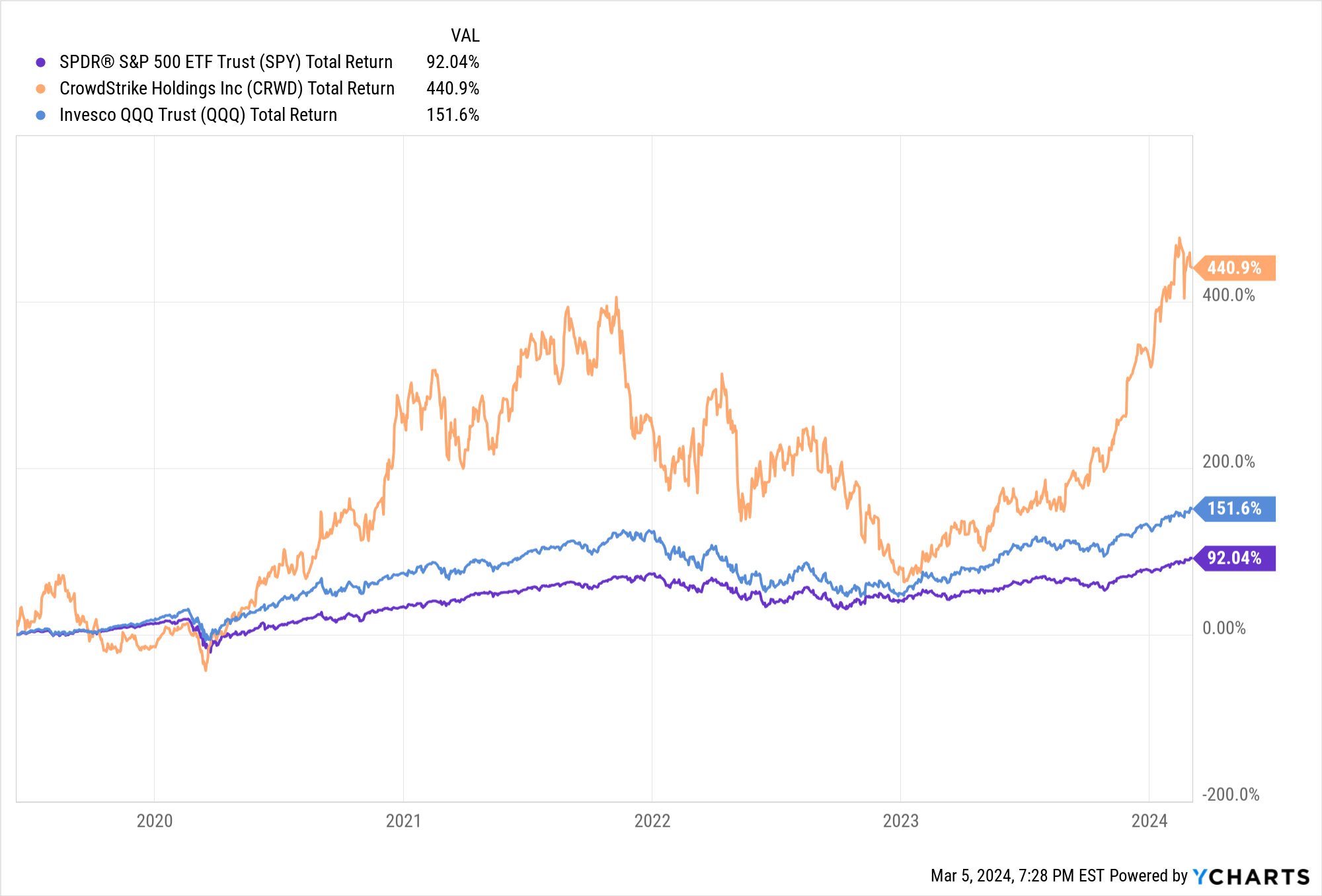 Here's the stock vs. the S&P500 and the Nasdaq-100 - using $SPY and $QQQ index proxies - since the CRWD IPO, both on a total return basis, ie. any dividends produced are re-invested back into buying additional stock. (CRWD pays no dividend, so for CRWD, the price gain = the total return gain).