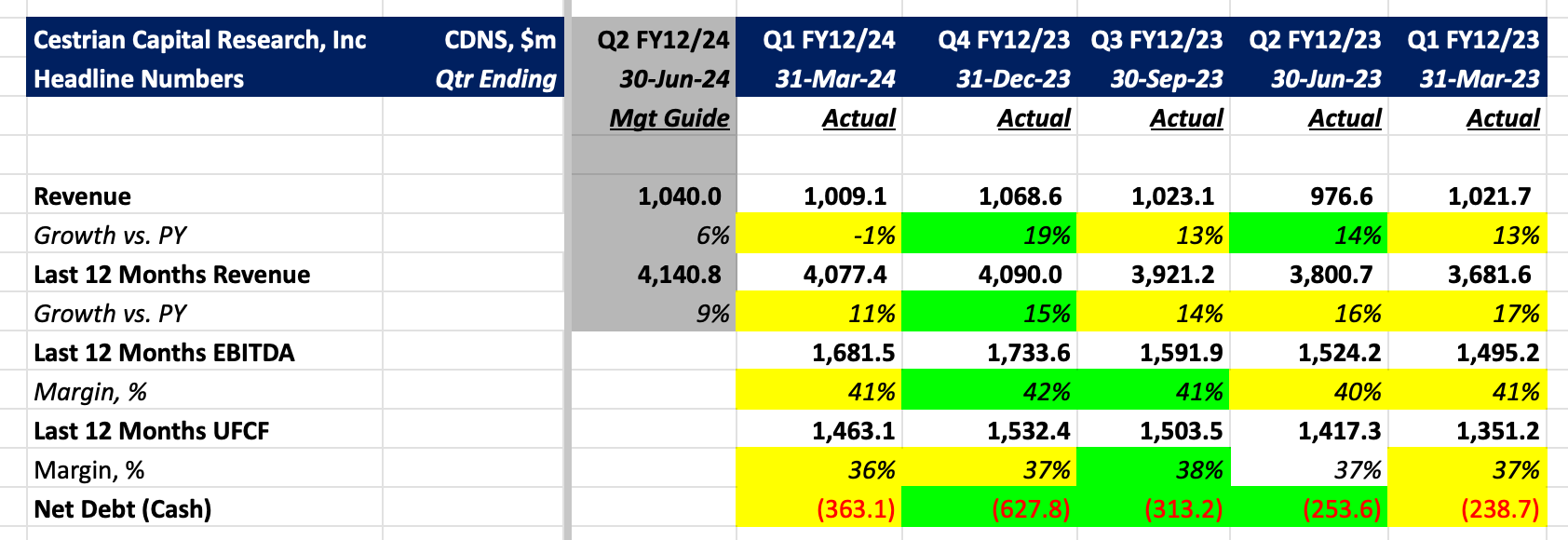Cadence’s Q1 was somewhat ho-hum on the revenue line, more encouraging as regards the order book. Below we lay out the headline numbers (before the paywall) and then take a look at the detailed financials, valuation analysis and our stock price projection, technical analysis and rating (after the paywall).