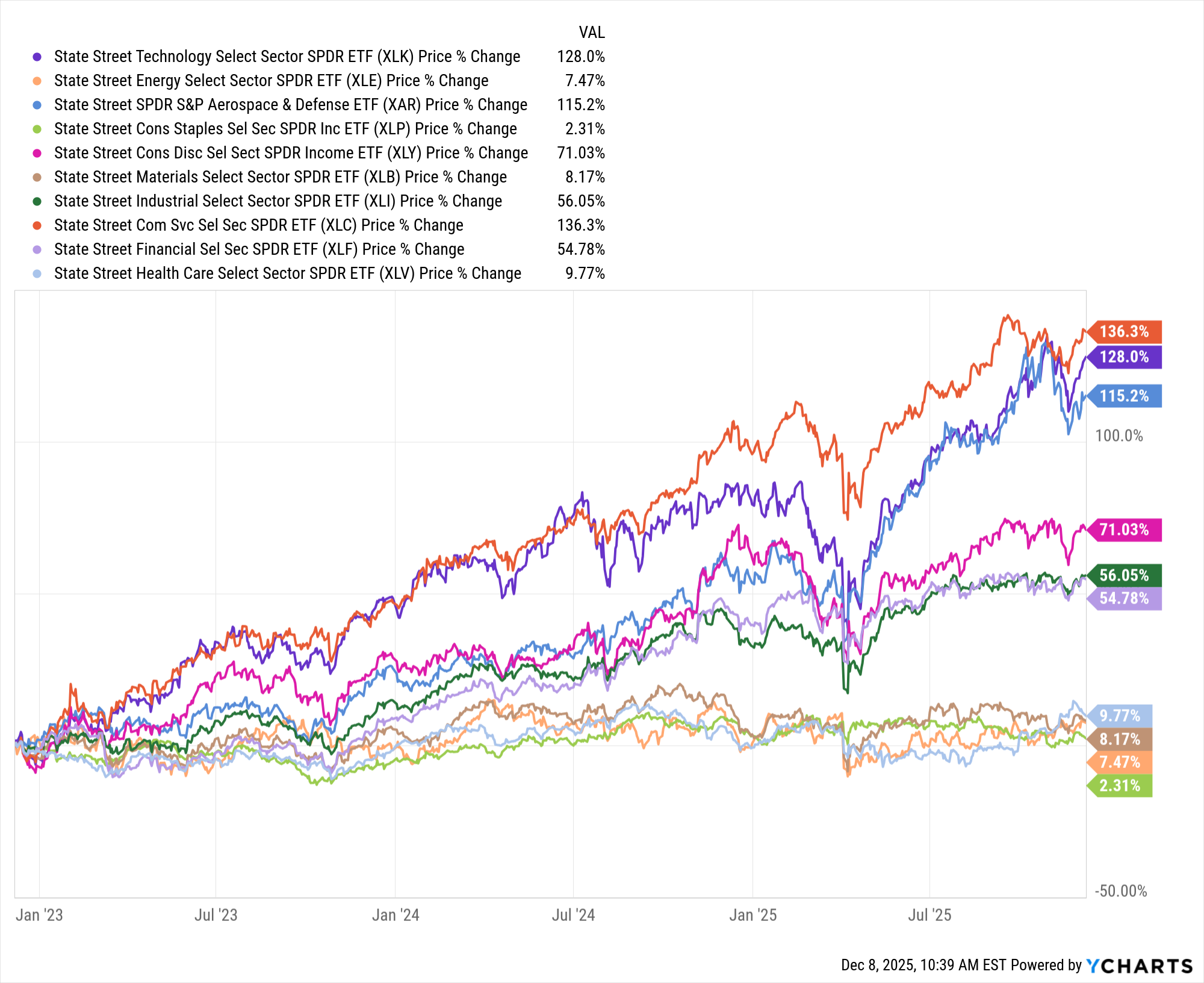 In the last three years, energy as a sector has languished vs. the S&P500. Here’s a chart of the major sector ETFs over that period.