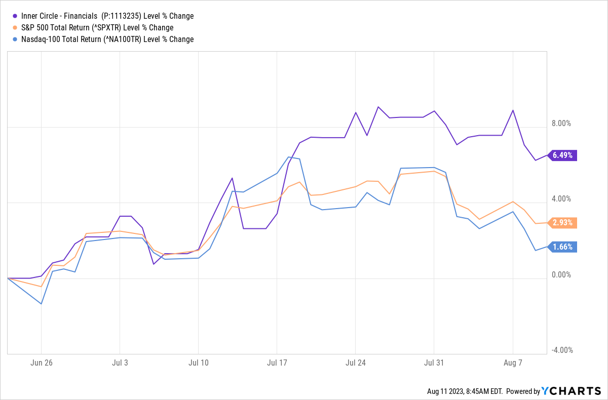 As tech started to weaken at the half-year point, we thought it wise to build some rotation opportunities within this service. We set up two baskets of stocks, one in the financials sector, and one pulled from within the constituent parts of the Dow Jones index.