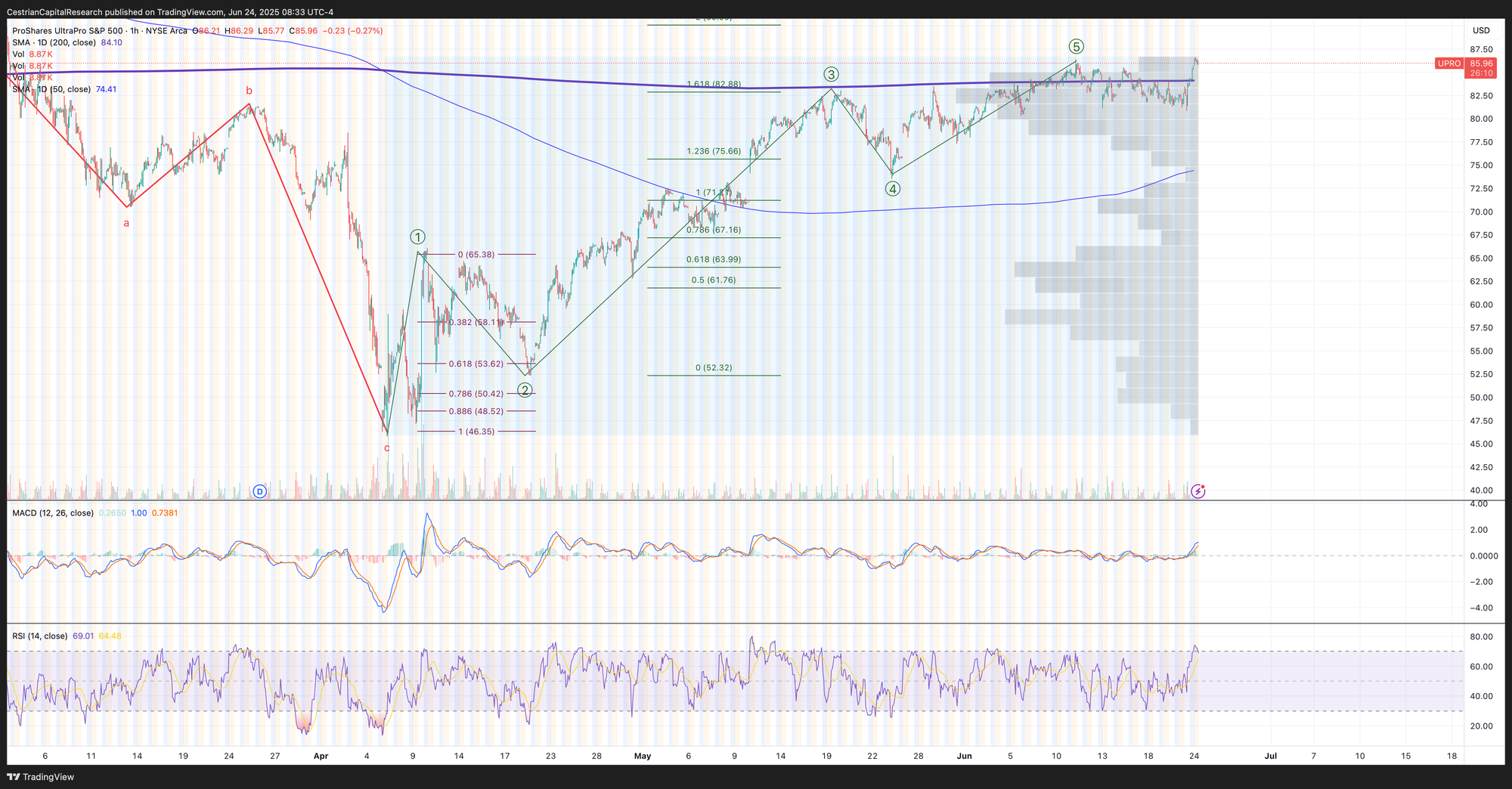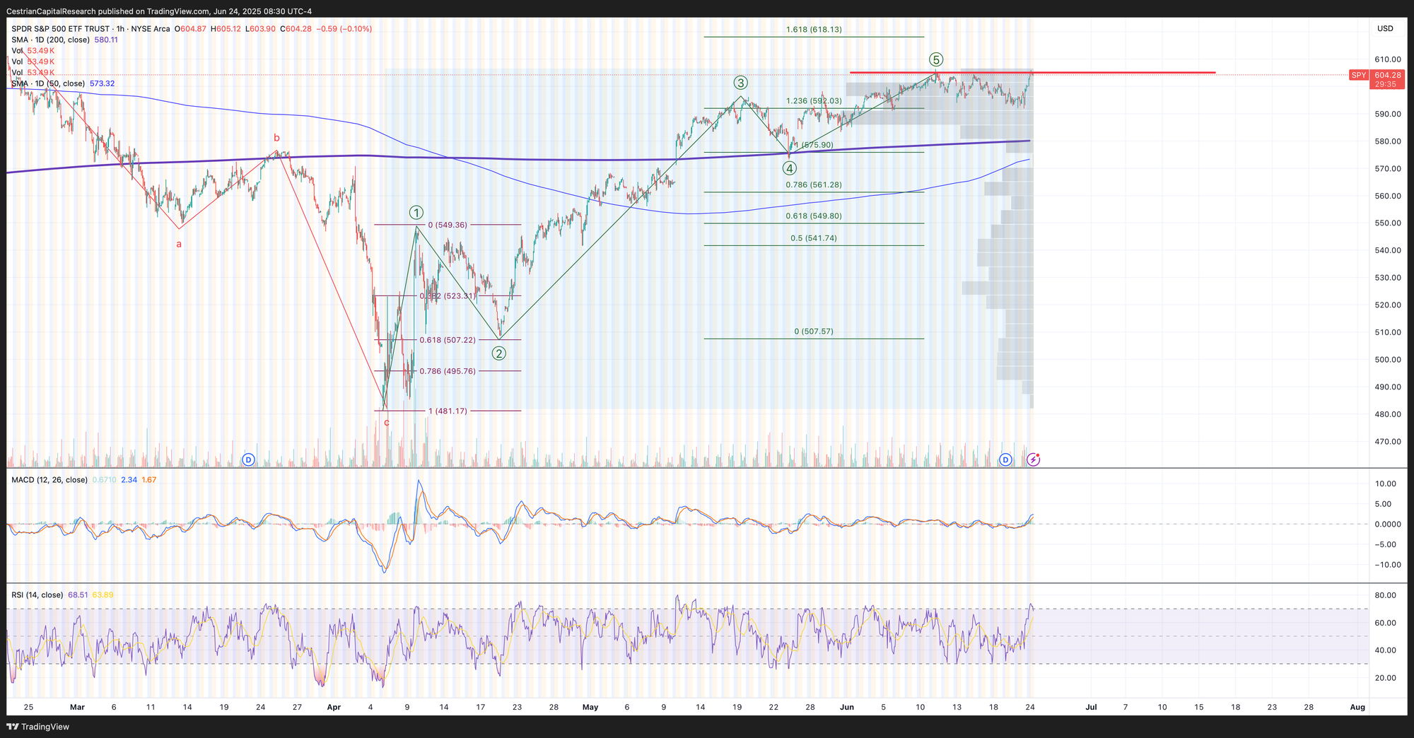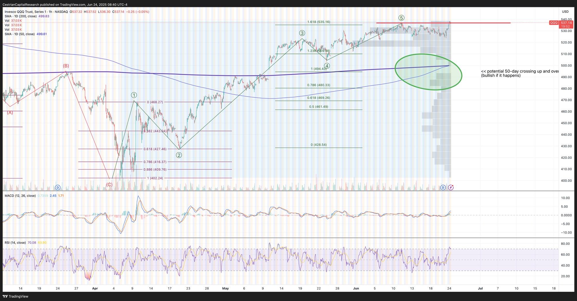I know a lot more about investing than I do about geopolitics and so I won’t claim to know what the prospects are for a lasting peace are in the Israel/Iran conflict, but I do know that right now there is some market euphoria at the thought of it. The charts today should be read in that light. This move up may see resistance levels broken up and through in the major indices - for some days now I have been pointing out the stubborn resistance levels overhead in the S&P500, the Nasdaq-100, and some sector ETFs like $SOXX - but if not then this is merely the denouement of the bull move up off of the April 7 lows. And if true we will see some selldown before another attempt on new all-time highs.