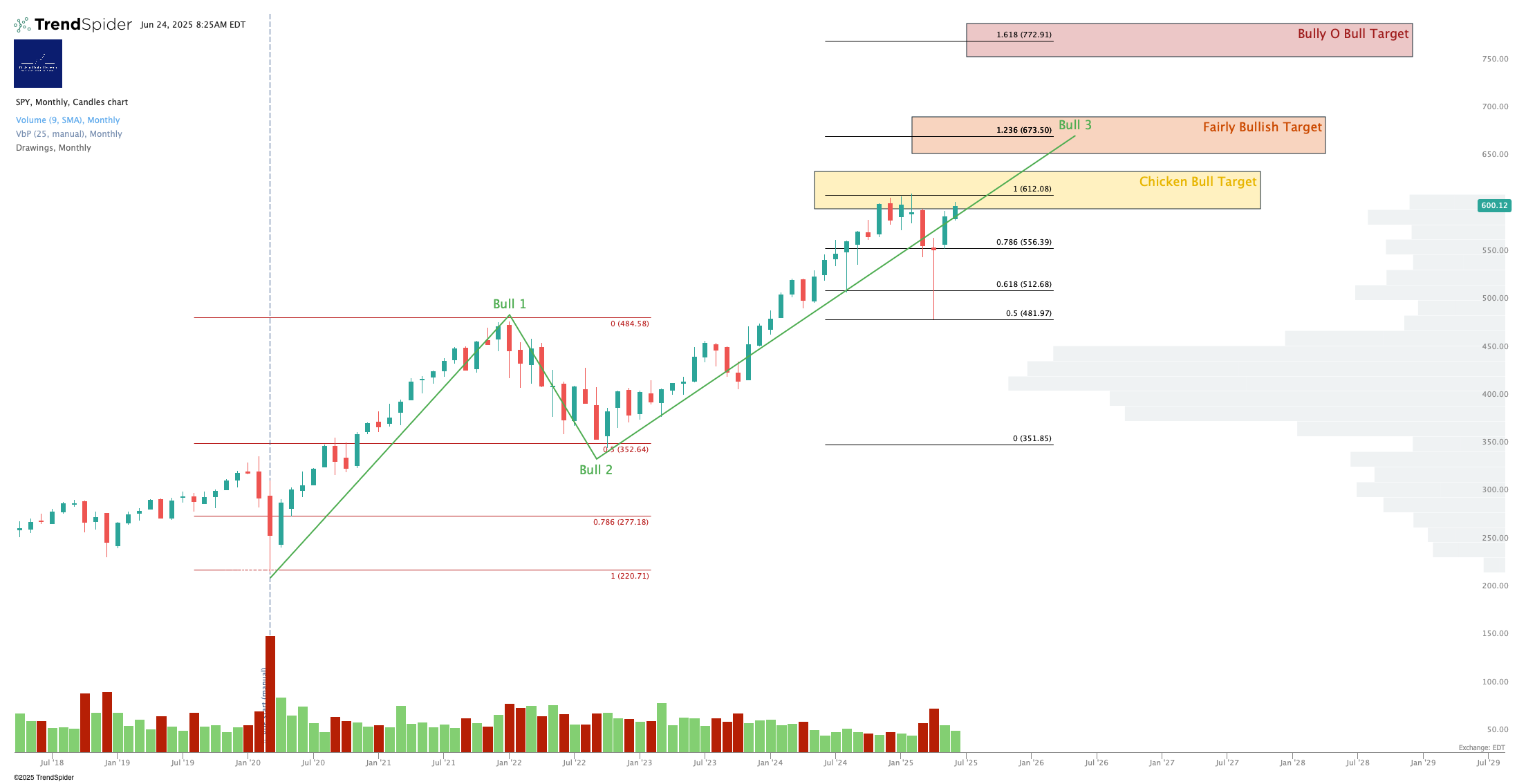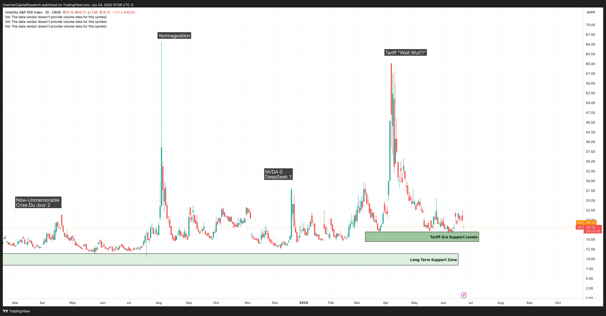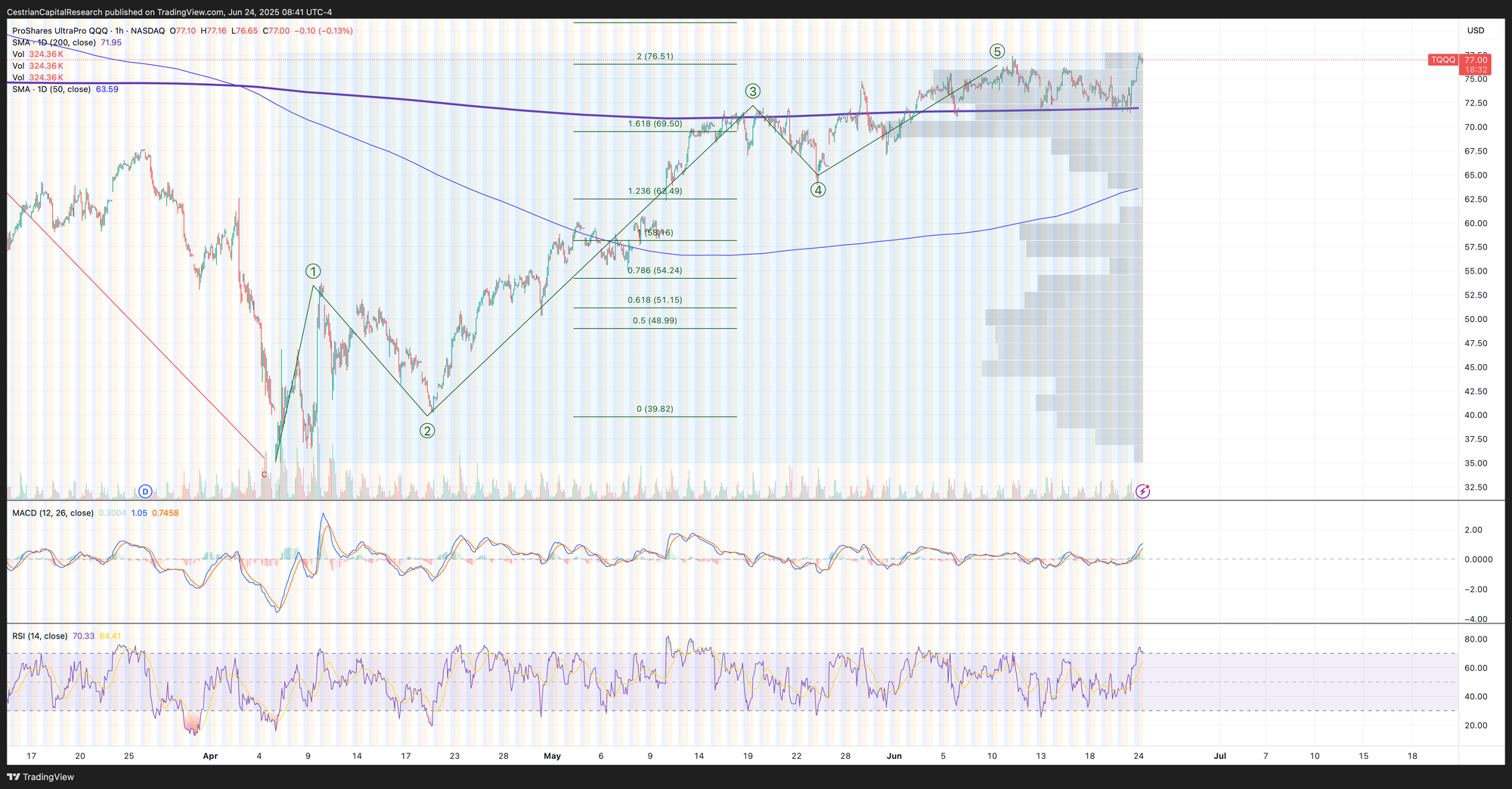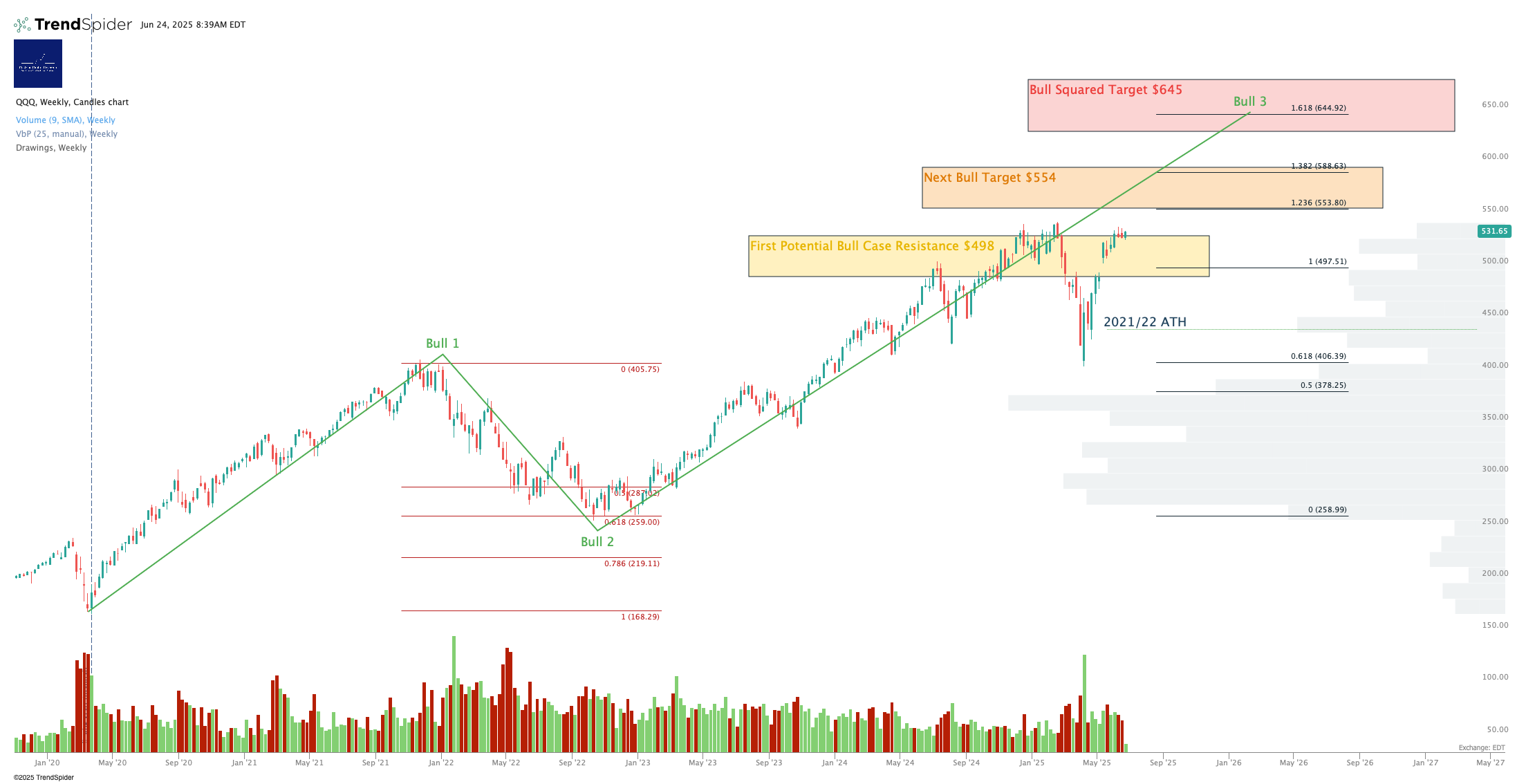 I know a lot more about investing than I do about geopolitics and so I won’t claim to know what the prospects are for a lasting peace are in the Israel/Iran conflict, but I do know that right now there is some market euphoria at the thought of it. The charts today should be read in that light. This move up may see resistance levels broken up and through in the major indices - for some days now I have been pointing out the stubborn resistance levels overhead in the S&P500, the Nasdaq-100, and some sector ETFs like $SOXX - but if not then this is merely the denouement of the bull move up off of the April 7 lows. And if true we will see some selldown before another attempt on new all-time highs.