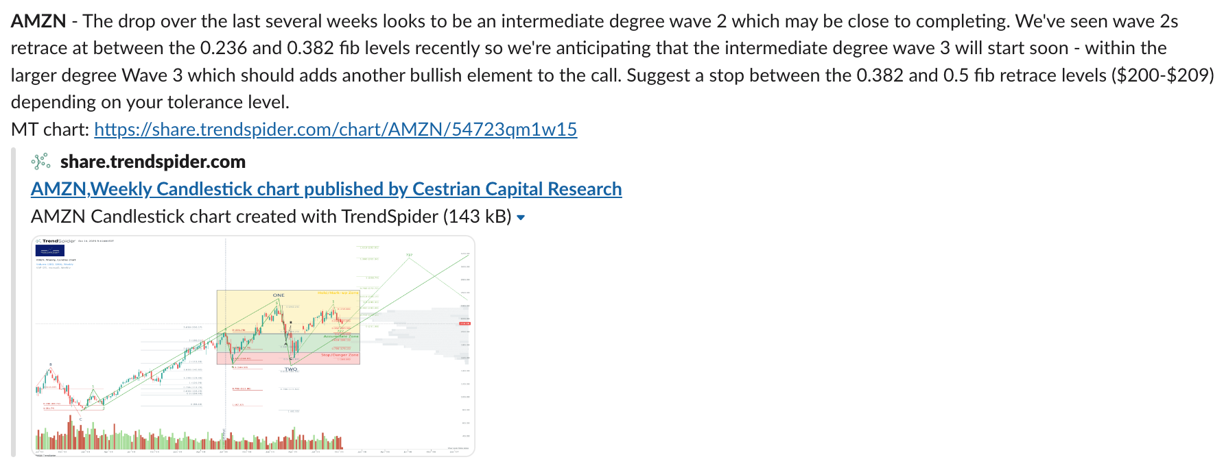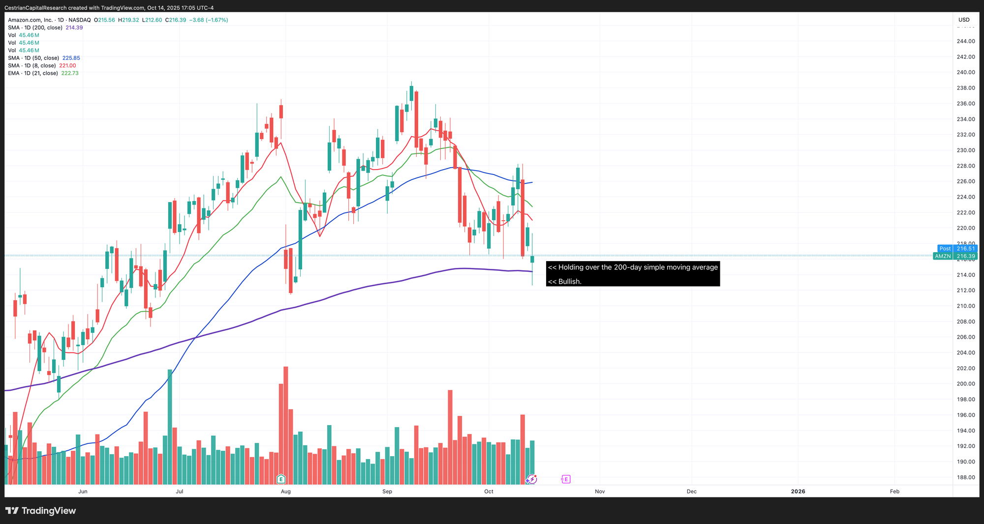 We thought that AMZN holding over the 200-day moving average, despite fairly heavy selling in recent weeks, was likely bullish.