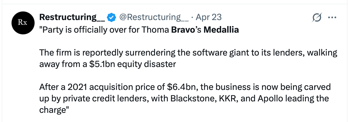 (If you search the stories about the Medallia loan-to-own whereby the equity sponsor was wiped out, the sheer glee is remarkable. This is another bullish signal for software in my view. Bull runs are born from mockery.)