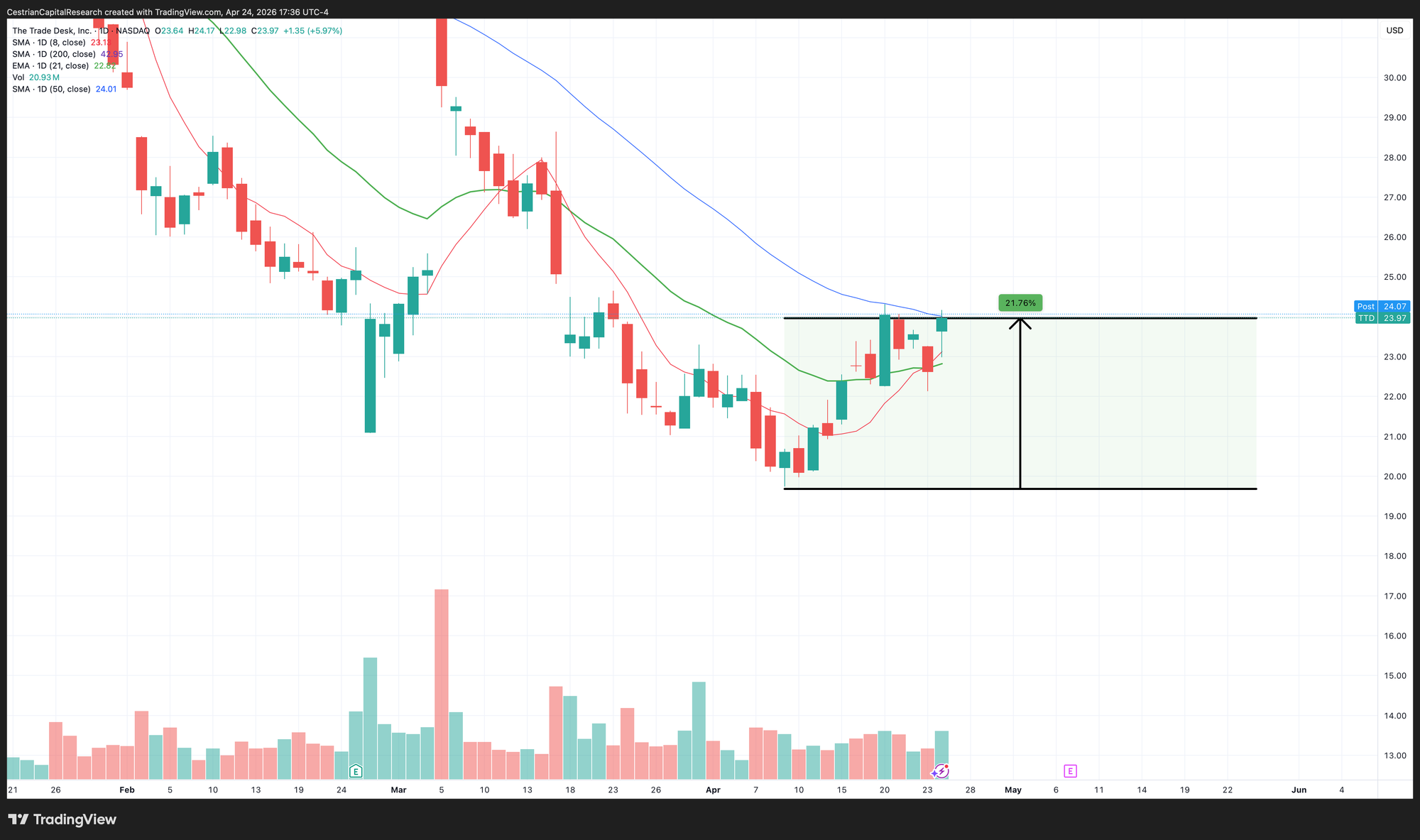 Zooming in, the stock is now pushing up at the 50-day SMA from below. The stock is up 22% from the lows and is holding nicely over its 21-day EMA.