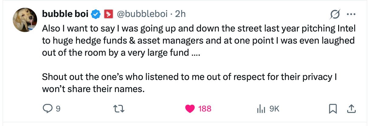 This is very bullish for software investors. Because hardly anyone thinks independently of the crowd; so anyone making the big bucks from $INTC or $ARM right now was duly laughed at not so long ago.