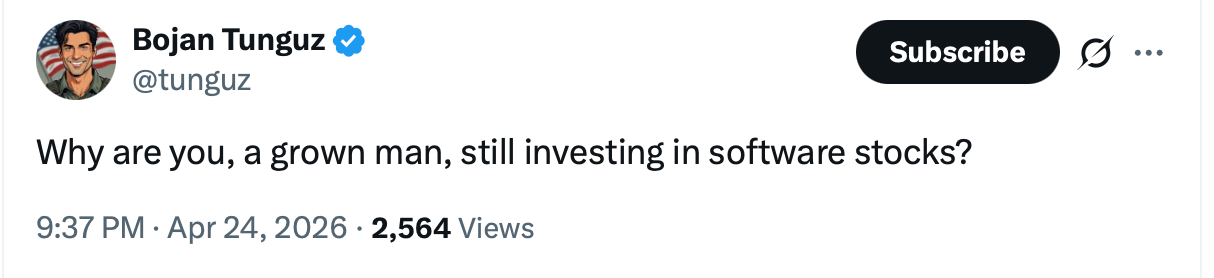 The average investor has been educated that enterprise software companies have no moat, because the cost of producing a line of code was just deflated by 10x or more. Anyone who has held software from the highs in 2025 to the lows in March has been hit by a hurricane of dot-com-crisis proportions.