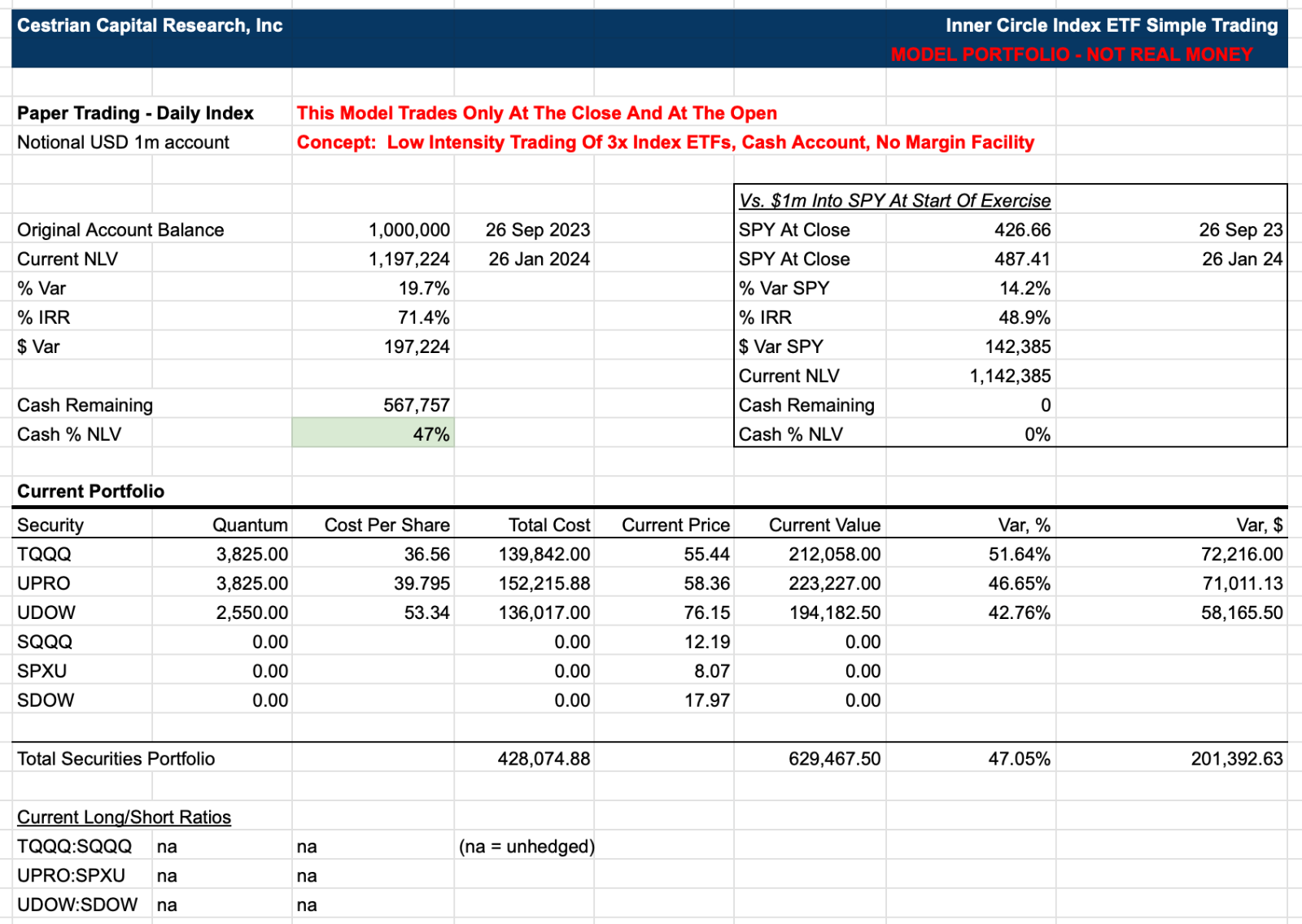 The goal of this portfolio is to beat buy-and-hold the S&P500. We do this by using 3x ETFs that provide leveraged long, and leveraged short, exposure to the S&P500, Nasdaq-100 and Dow Jones 30. The portfolio is intended to have low trading volume (trades happen only at the open and the close; and even then, most days see no trades) - all trades are posted hours ahead of time as an alert in our Slack system. It’s a model cash account, no margin facility. Inception was 26 September 2023.