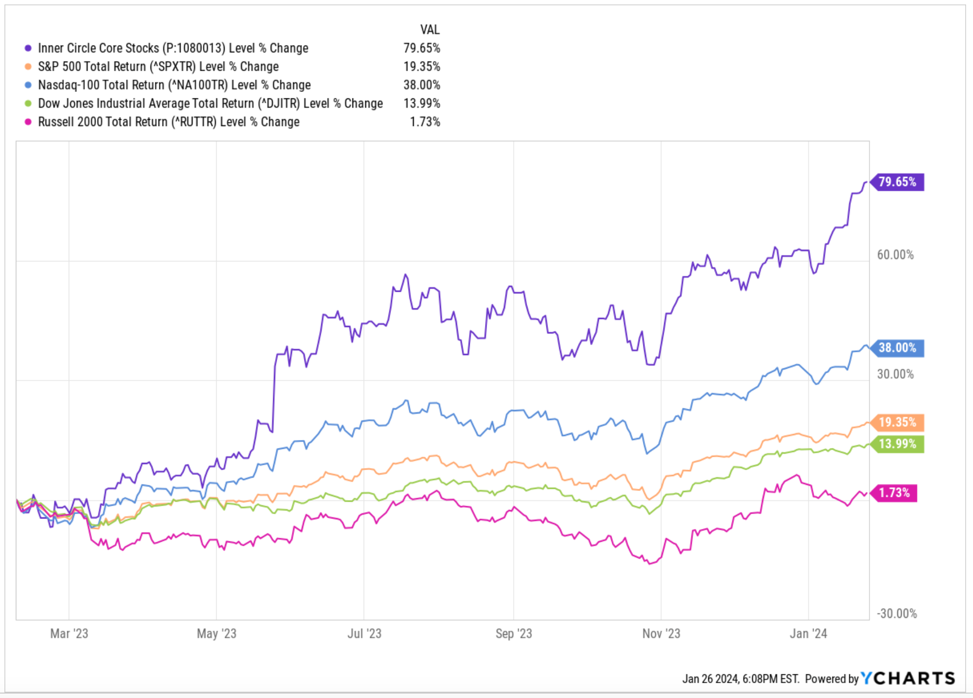 Performance: +79.7% vs. +38.0% Nasdaq vs. +19.4% S&P500 vs. 14.0% Dow vs. +1.7% Russell 2000.