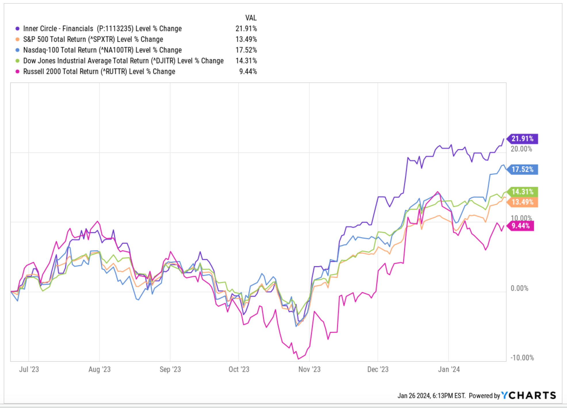 Performance: +21.9% vs. +17.5% Nasdaq vs. +14.3% Dow vs. +13.5% S&P500 vs +9.4% Russell 2000.