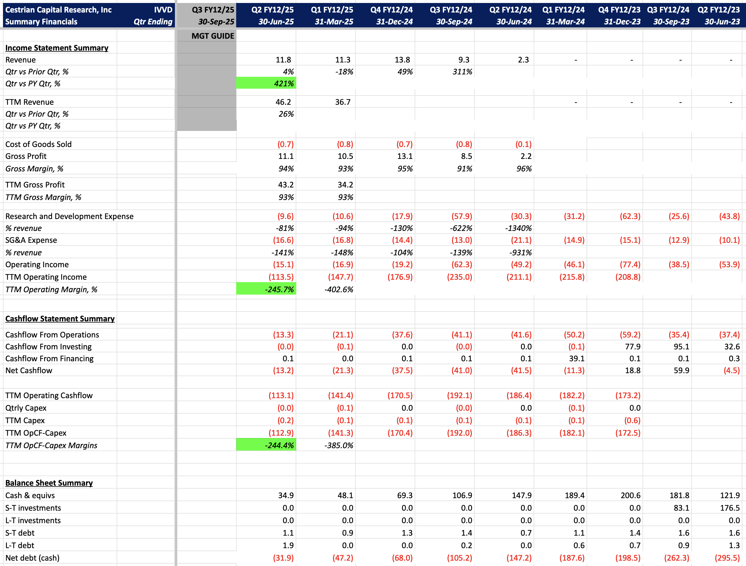 Increasing TTM revenue and margin. At the time of this print, it only appeared that there was only enough cash on hand to carry the company for another 6-7 months, without covering the cost of the upcoming clinical trial. However, Ivivyd reported a public stock offering of $57.5m on August 22, 2025, which may likely cover this cost or provide sufficient funding to maintain the business at current spending for 1.5 years (including cash on hand).