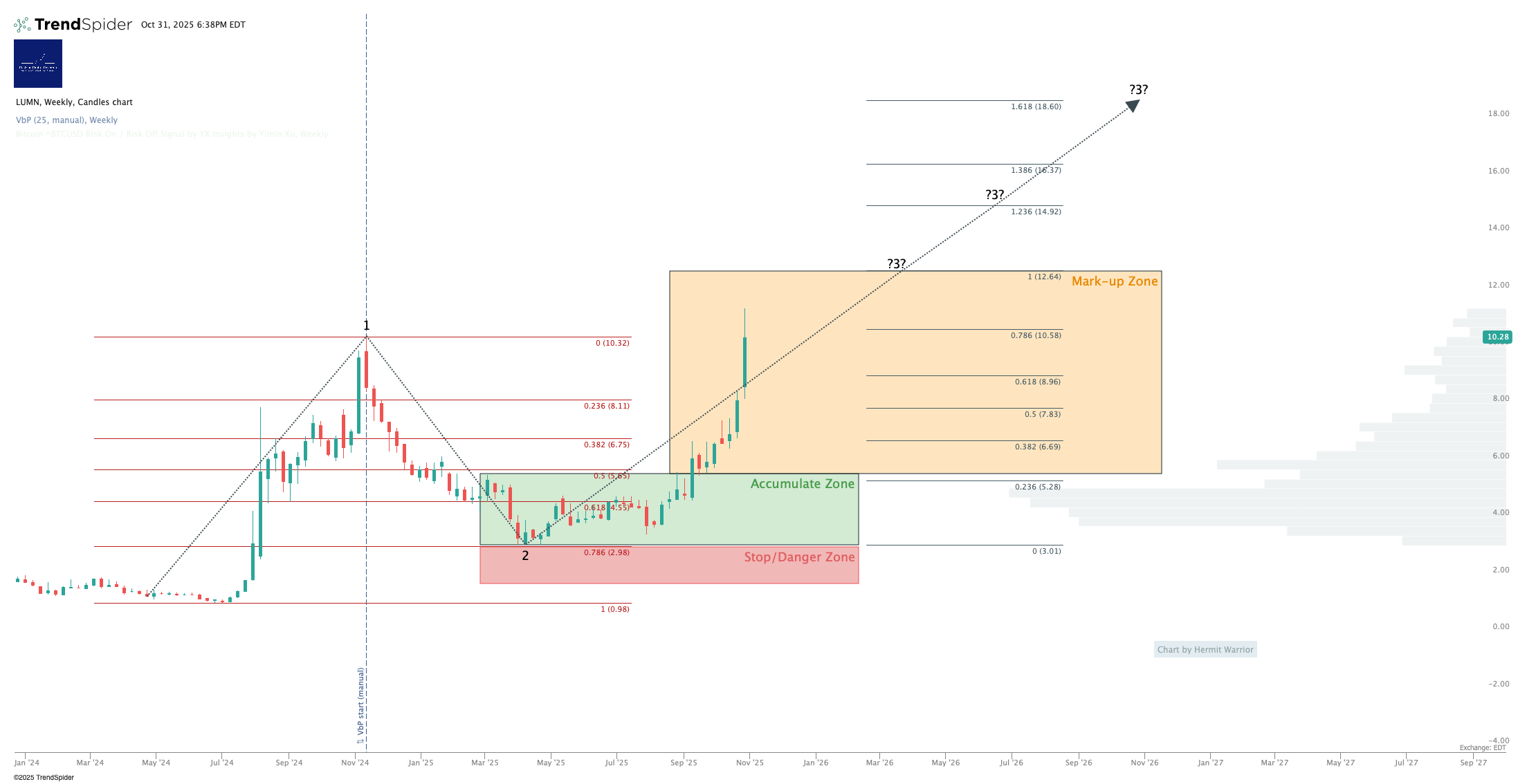 The stock is in the markup phase ie. large accounts are done buying and now it’s time for the good news stories to make their way around the market, to encourage the poors to buy too. After a period of time, bigs will dump their holdings on the poors in the ordinary course. I think that may start to happen around $12.60, the 100% Fib extension of that Wave 1 placed at the Wave 2 low; the stock could make it to $18 (the 1.618 Fib extension) in time but at that point I myself would definitely be selling.
