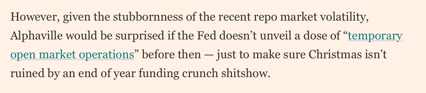 So FOMC is done, the 25bps cut confirmed, and the new QE is about to begin. This is in no way bearish for risk assets. We may get a selloff on Thursday but if so it’s just a way for market-makers to take out any new levered longs that jumped in overenthusiastically during the post-Powell run-up this afternoon. The price of money is coming down; the supply of money is going up. That supply will end up in bank reserves, and banks will make some of those additional reserves available to brokerage desks serving everyone from Connecticut’s Masters of the Universe to Chad Jnr sat in his mom’s basement YOLOing 0DTEs. And yea verily will everyone from the MOTUs to the YOLO brigade duly throw that money at securities. Meaning that in all likelihood, number go up into year end.