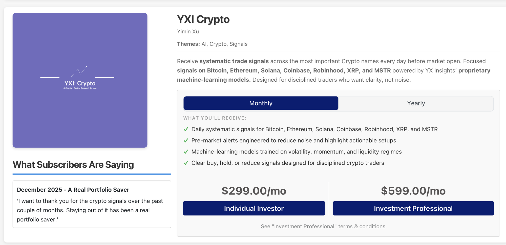 If you’ve been burned trying to second-guess the crypto market, or you’ve been cautious and kept away, read up on our YXI Cryptocurrency Algorithmic Signal Service. It’s a cold-as-ice way to play Bitcoin, Ether, Solana, Ripple, and key crypto-related stocks like Robinhood and Coinbase, without having to listen to this week’s cringeworthy crypto-influencer podcasts or second guess what Peter Thiel is planning for his extensive Ether holdings.