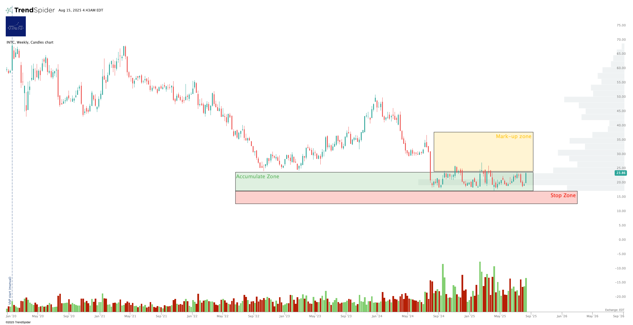 Lately there have been some signs of life in the volume x price chart. The “Accumulate Zone” below represents the big spike in volume you see in the price range $17-24/share. These kinds of sideways rangebound patterns at the lows aren’t always a sign of Big Money building stakes, but they often are.