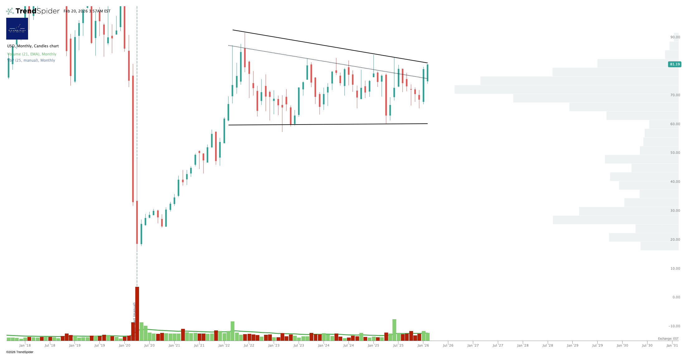 $USO has run right up to resistance, likely in anticipation of potential military action against Iran. You can open a full page version of this chart, here.