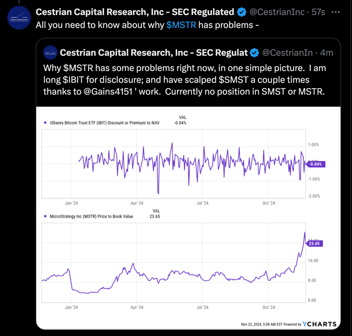 Well, along came Bitcoin ETFs to spoil MSTR's party. If you can buy $IBIT from Blackrock at around 1x NAV, why buy $MSTR from Mr. Saylor at around 3x NAV or indeed 23x book value?