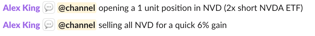 Yesterday was, at best, a dress rehearsal for how to play the market when it does turn from bull to bear. And at worse it was a few days into a new bear cycle. We shall see. In Q1 2022 you knew the market had changed because the winning move was no longer buy dips, but instead, became sell rips. This week has been the same. If you saw green? Selling it was the thing to do. Personally I have been selling small green positions for some days now, nothing dramatic but just a way to keep some realized profits rolling in whilst - for now - eating some unrealized pain on longer term equity holdings. (Bond ETF holdings are working out just fine). My assumption - which is still holding up, just - is that we remain in a bull market so I have been too queasy to hold short hedges for very long. In a bull market one should be nervous of short hedges and protective of their gains. When they go green it is better to not wait around too long before selling and garnering the spoils. Of course dips can dip deeper than expected, and your sale of the hedge may prove too early, but in a bull market that mistake is preferable to being stuck with a slew of trapped shorts. Today, for instance, I scored a nice quick win on $NVD.