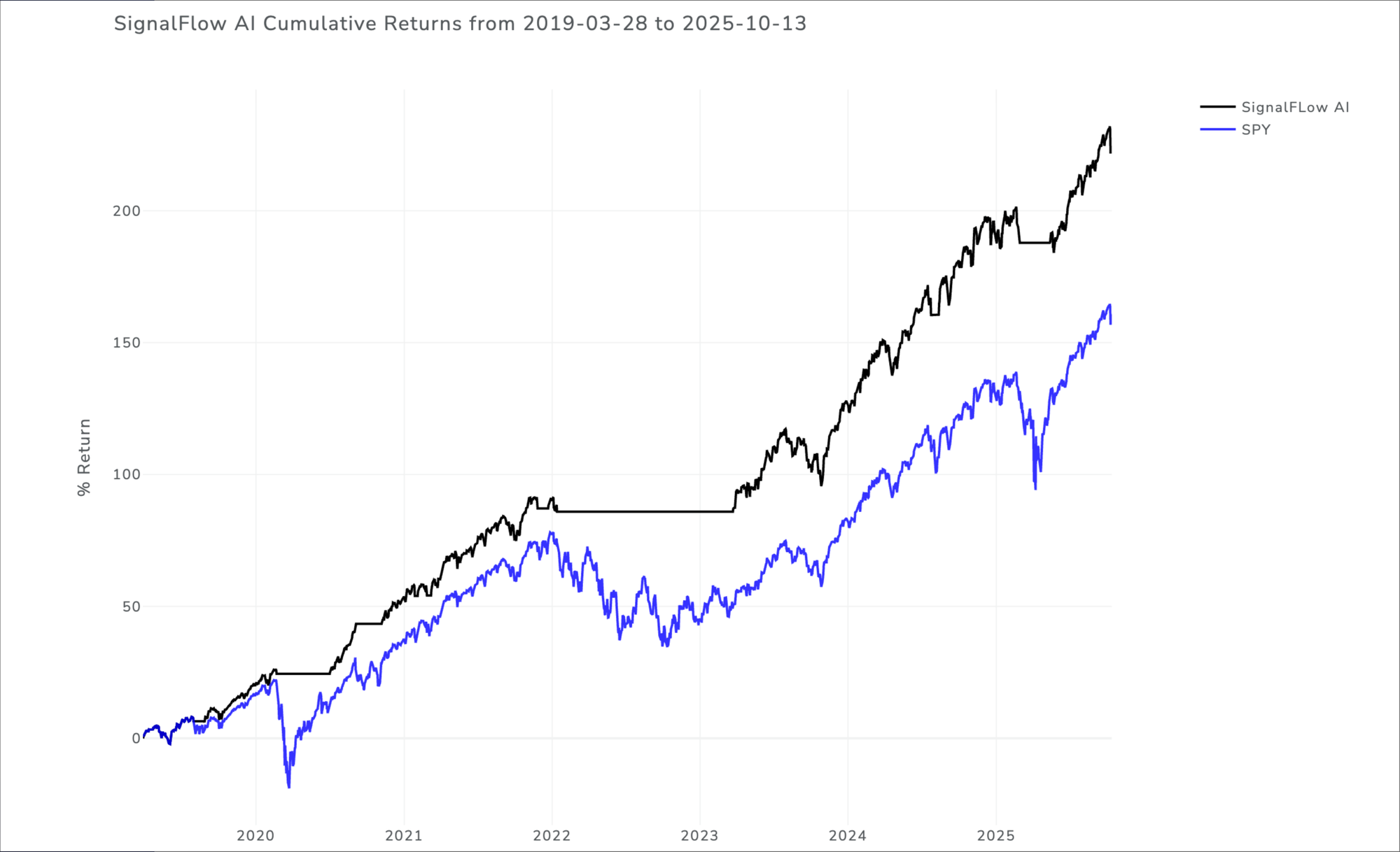 Here’s the cumulative performance of the algorithm vs. simply holding SPY over the same period. The service went live mid-2024; the data prior to that is backtested, the data after that is live trading ie. out in the wild, for real. You can see from a simple visual inspection the benefit of avoiding those material selloffs.