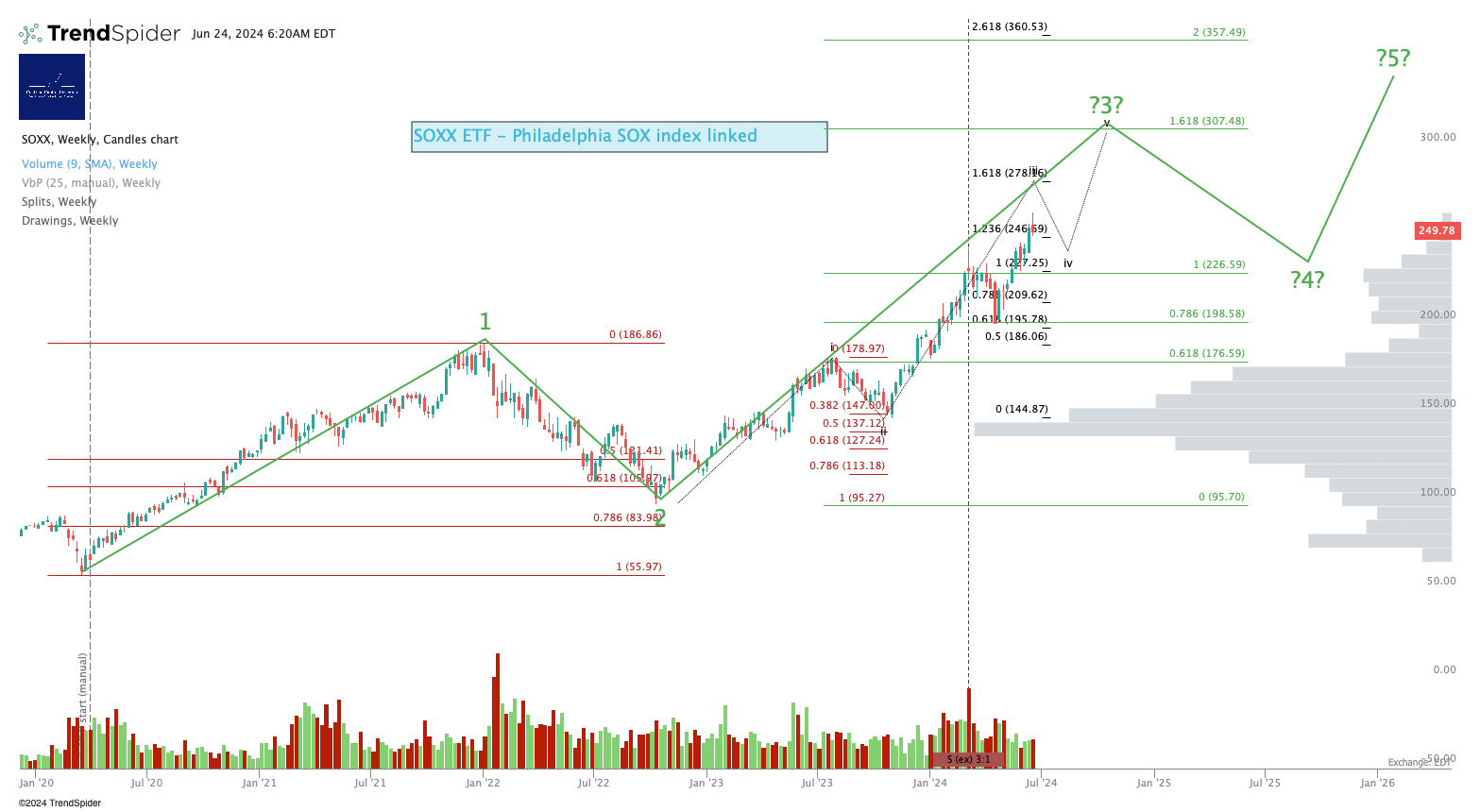 $SOXX is yet to hit that 1.618 extension, and I think it’s because of that more balanced distribution between the underlying names. So if Micron ($MU) and/or $AMD start to see capital inflows, $SOXX probably won’t be as badly punished as $SMH and it could even push up to that 1.618 extension before rolling over.