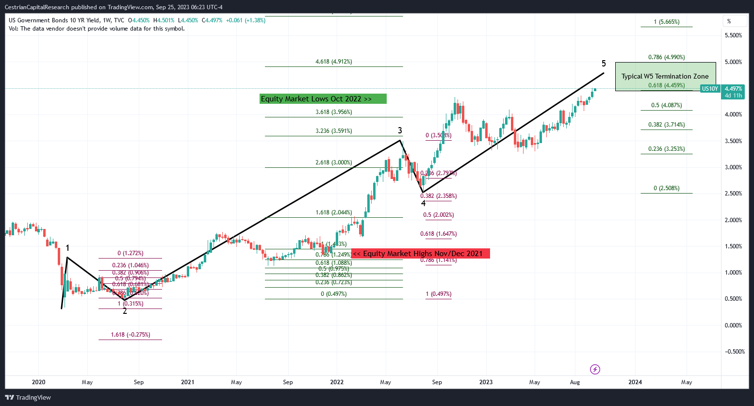 If, big if, one can successfully chart the US Treasury 10-year yield using Elliott Waves and Fibonacci levels (which since the 2020 lows by the way, you can), then it's likely the yield is approaching a Wave 5 high. Wave 5s typically terminate somewhere between the .618 and the .786 extension of Wave 1+3 combined. Here's our 10-year yield chart.