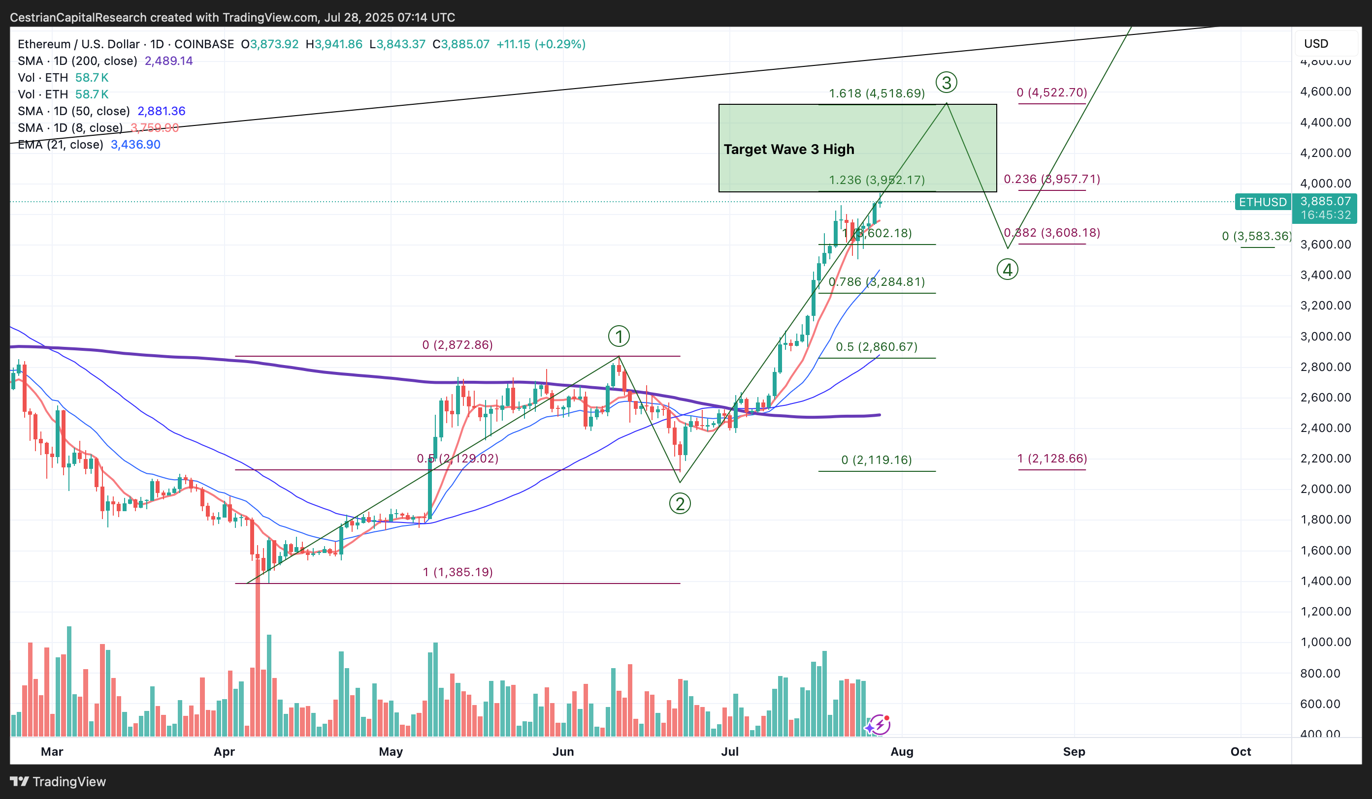 Just entering a potential Wave 3 topping zone. Most likely it carries on higher from here but if you own Ether, and I do, you might start to watch price a little more closely than normal right now.
