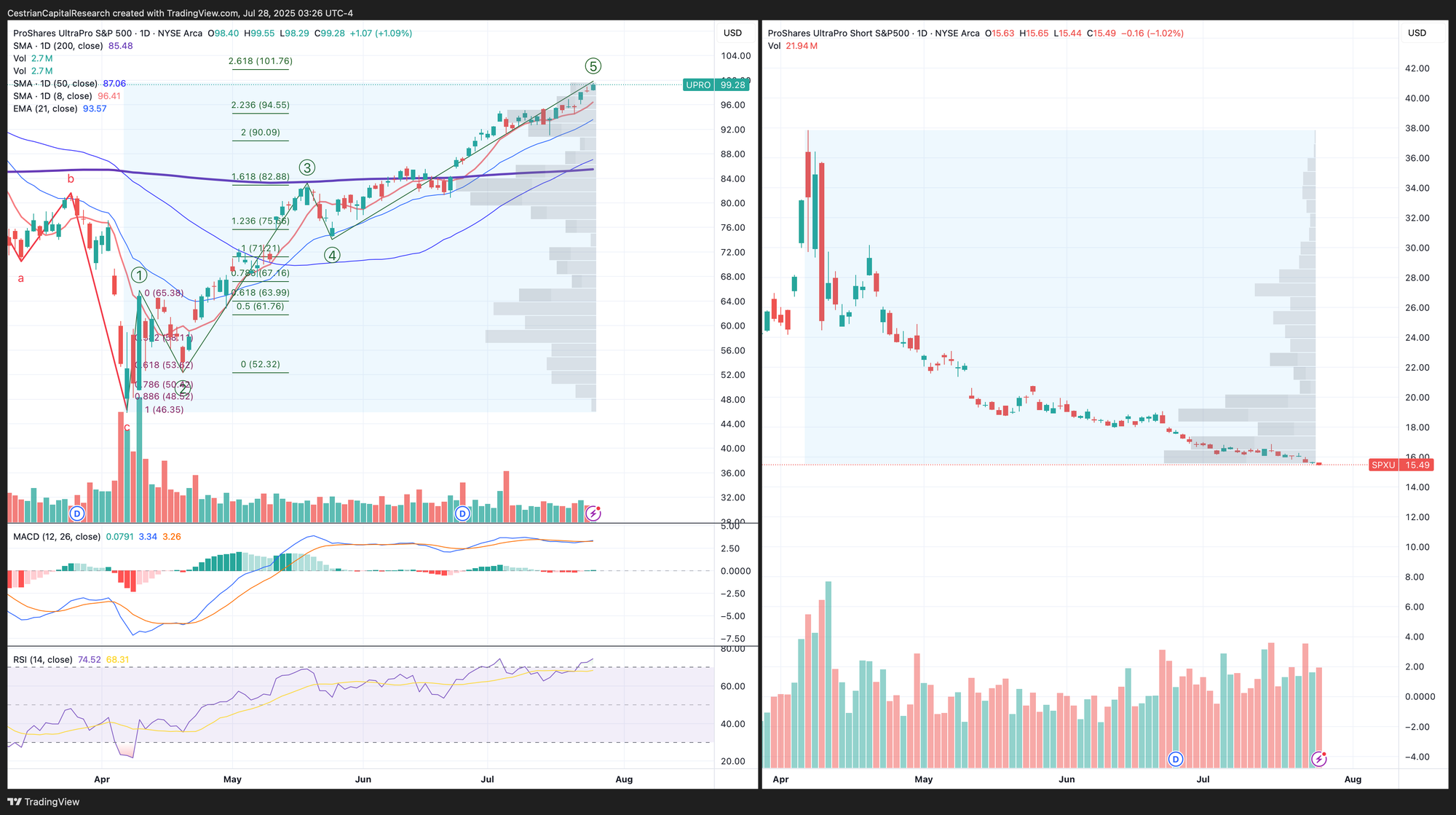 UPRO is now up more than 2x from the April lows. There is some accumulation on the short side (SPXU) now for sure - let’s see if that proves prescient or just another failure of genius.