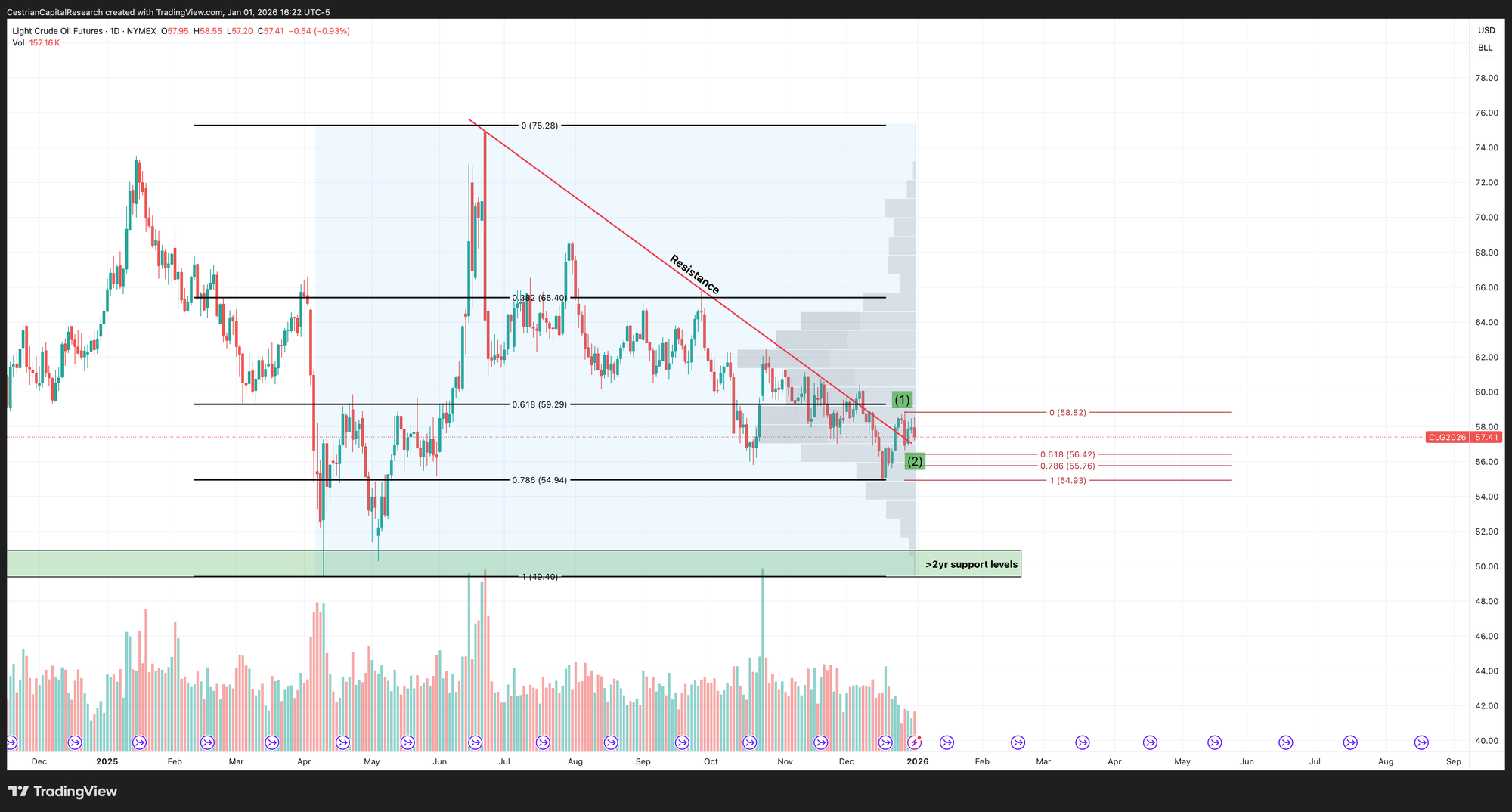 To repeat from New Year’s Eve: Oil “should” continue to sell off; the chart is setting up bullish in the short term in my view though.
