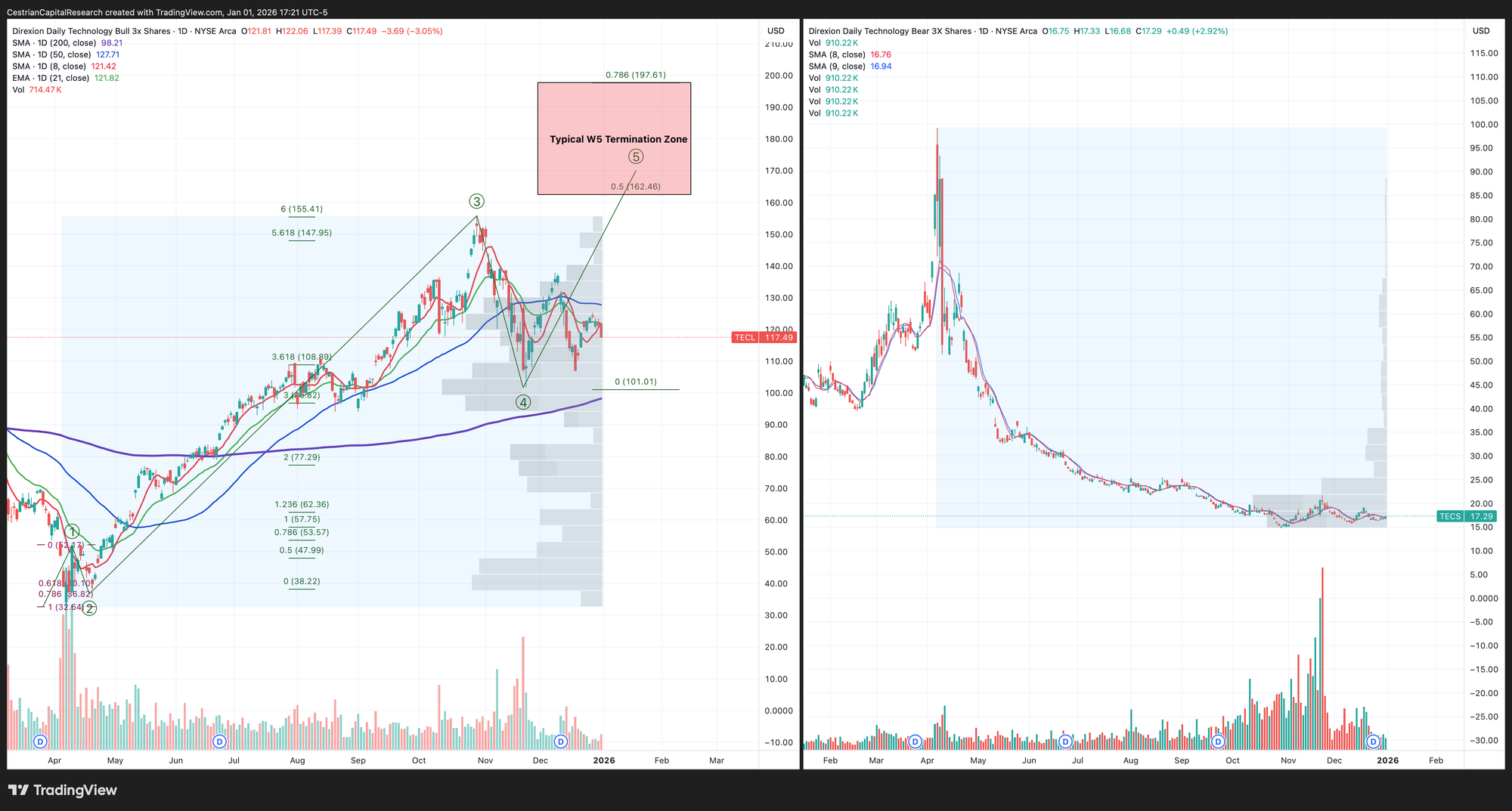 Note - TECL and its inverse TECS tend to be illiquid outside RTH with relatively wide bid/ask spreads.