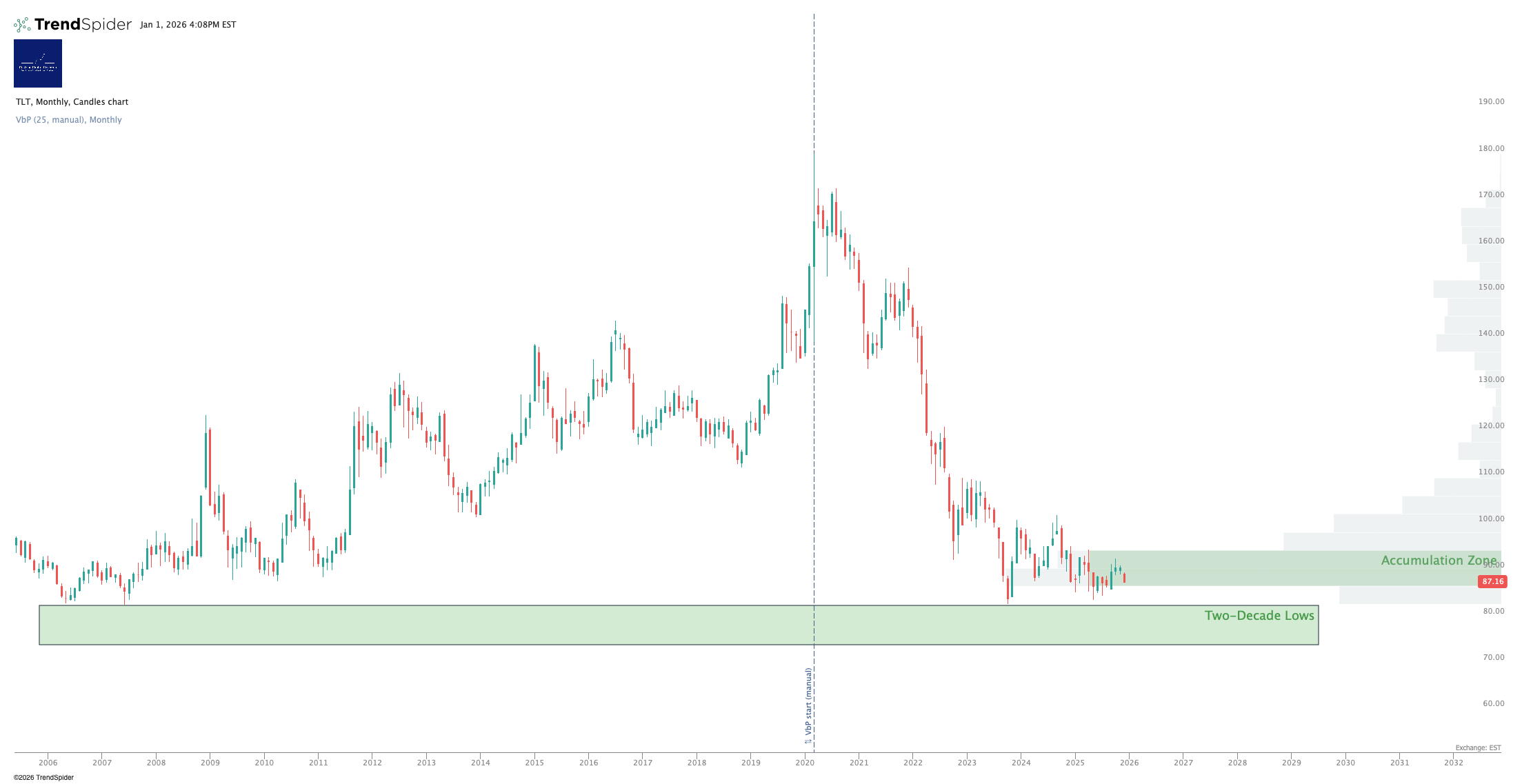 I would also be surprised if $TLT (= U.S. Government bonds, 20+yr term) stayed down here in the doldrums this year.